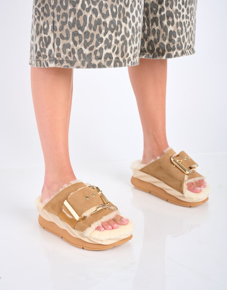 כפכפי סלייד עשויים עור עם בטנת פרווה פלאפית ונעימה, פתרון מעולה לחורף הישראלי. לכפכפים רפידה עם בליטה בצורת יהלום – פטנט ייחודי של 4ccccees, במטרה לשמור על קשתות כף הרגל בעת ההליכה. בנוסף, סוליית פלטפורמה משתי שכבות: שכבה פנימית מ-PU בצפיפות נמוכה, מה שמבטיח בלימת זעזועים טובה. שכבה חיצונית מ-EVA – חומר עמיד וקל.
