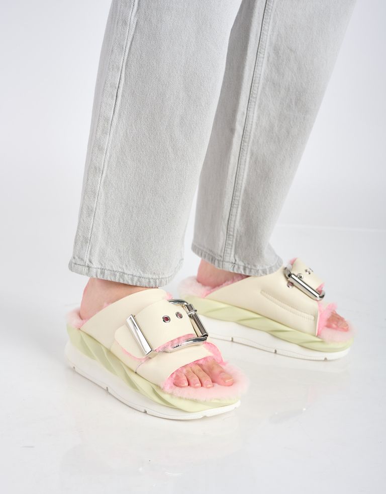 כפכפי סלייד עשויים עור עם בטנת פרווה פלאפית ונעימה, פתרון מעולה לחורף הישראלי. לכפכפים רפידה עם בליטה בצורת יהלום – פטנט ייחודי של 4ccccees, במטרה לשמור על קשתות כף הרגל בעת ההליכה. בנוסף, סוליית פלטפורמה משתי שכבות: שכבה פנימית מ-PU בצפיפות נמוכה, מה שמבטיח בלימת זעזועים טובה. שכבה חיצונית מ-EVA – חומר עמיד וקל.