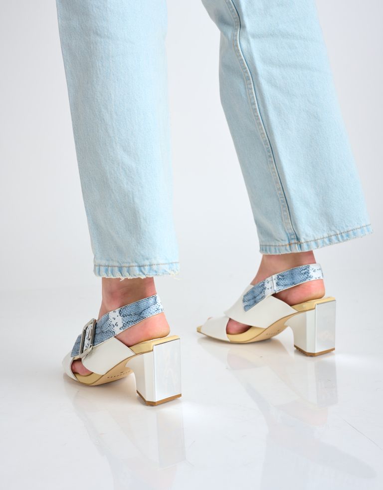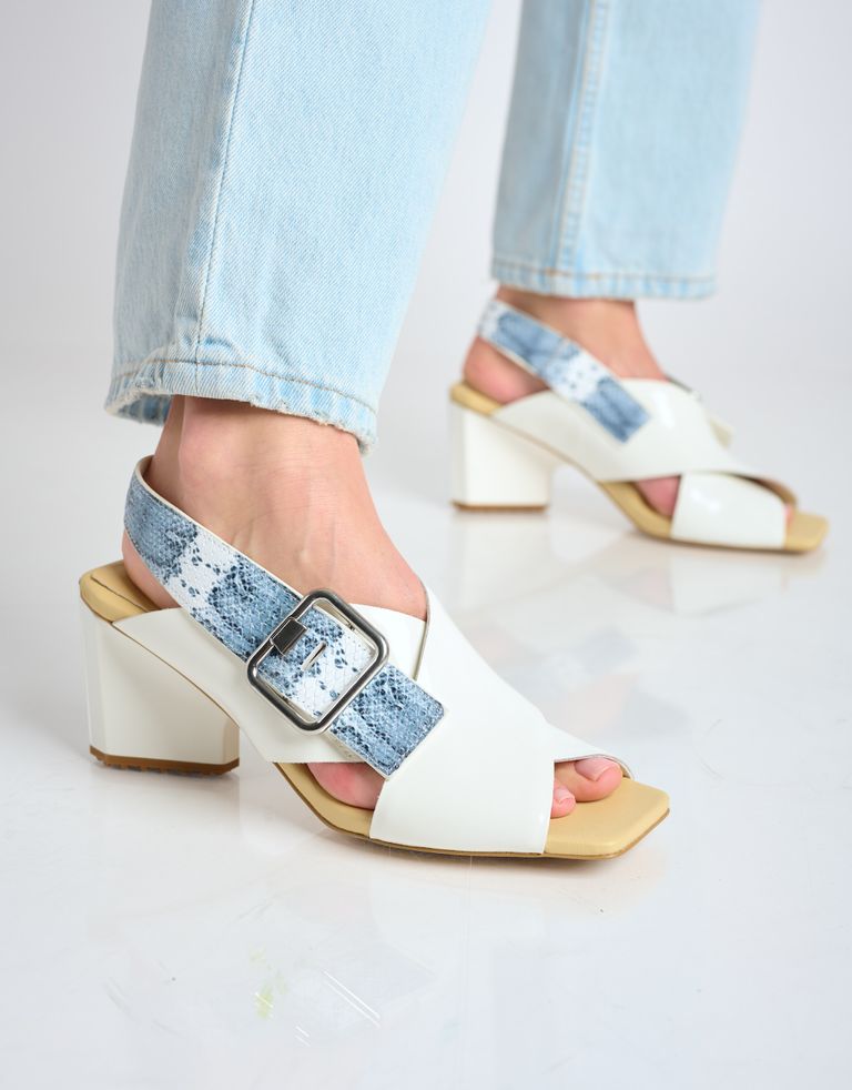 סנדלי איקס עם עקב. הסנדלים עשויים מעור רך, עם רצועות בשילוב טקסטורות ההפתעה האמתית מגיעה עם עקב רחב, יציב ושובה הלב.