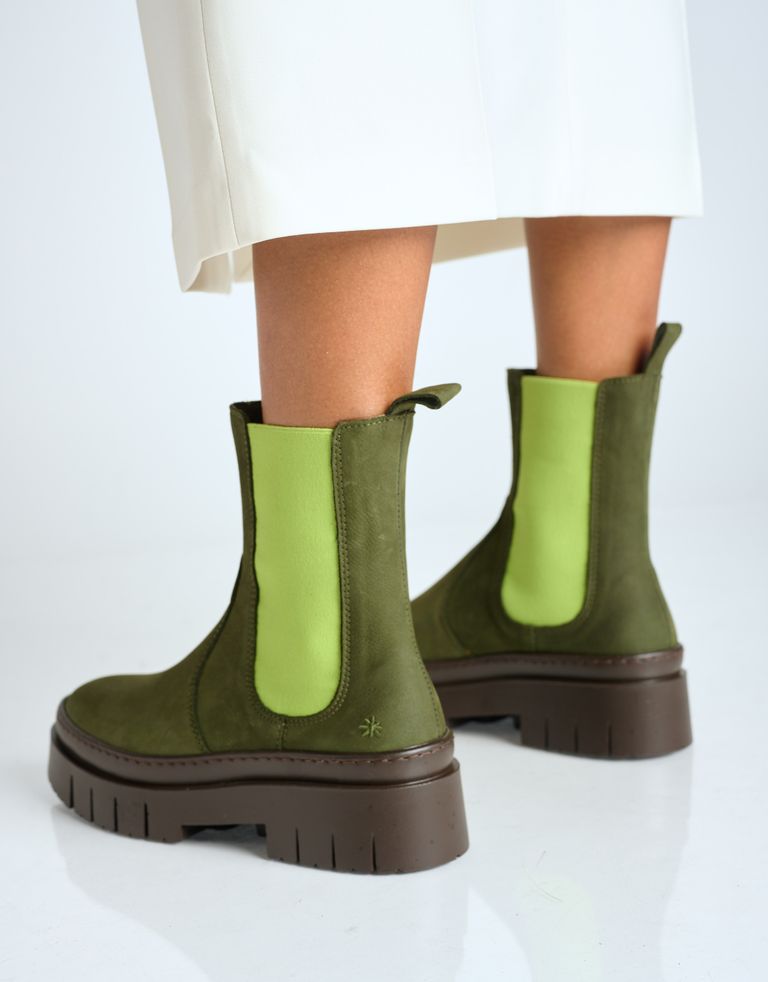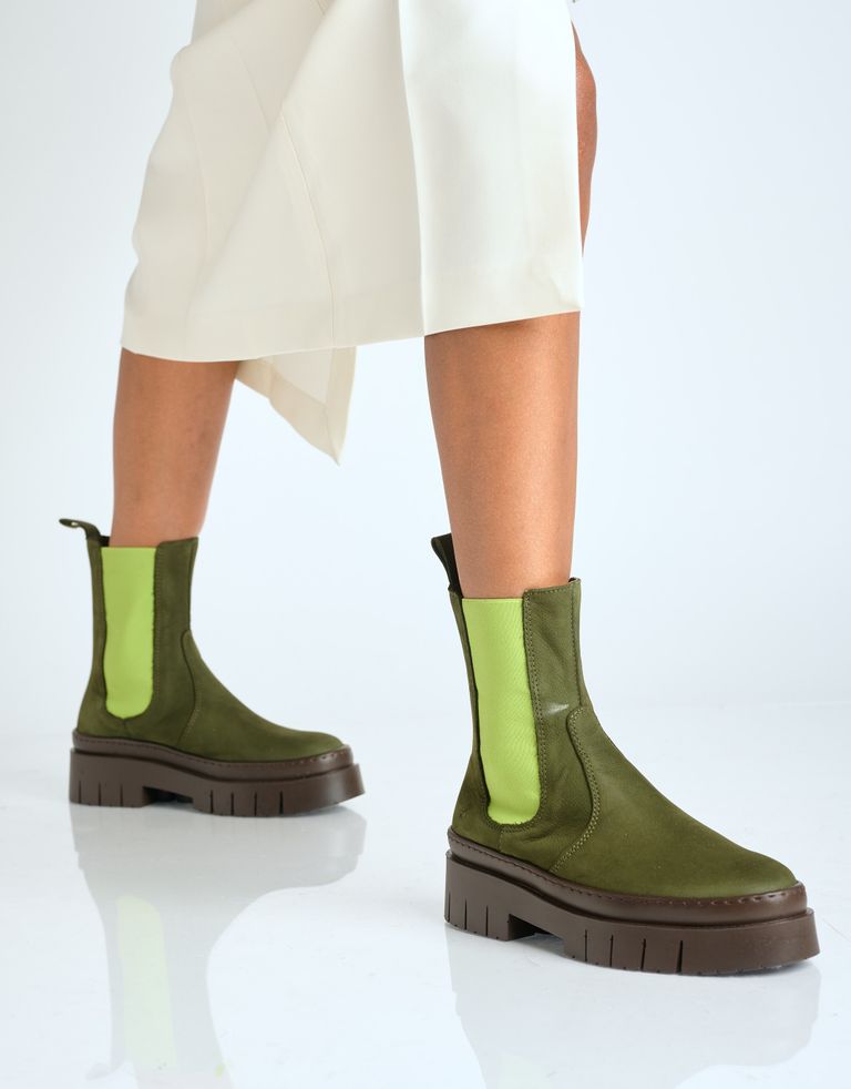מגפי צ'לסי צבעוניים, עשויים עור בתוספת גומי אלסטי וסוליית טרקטור.
