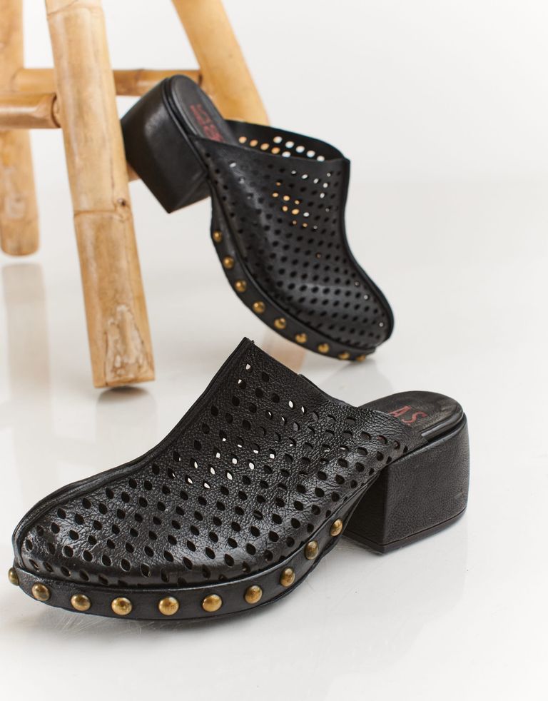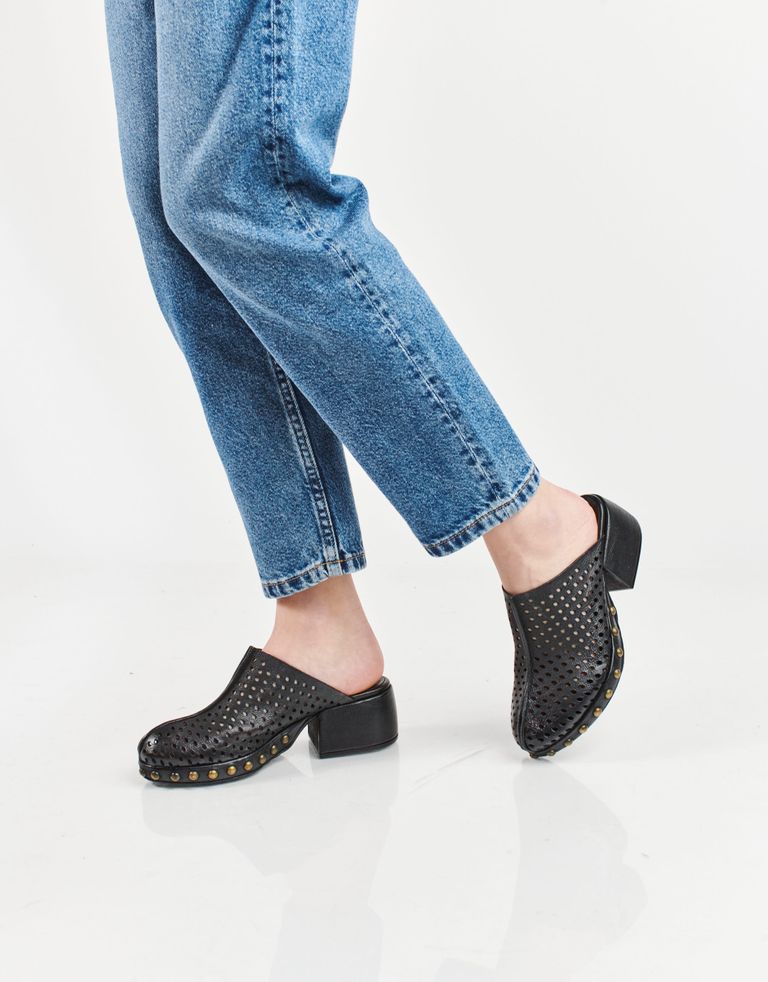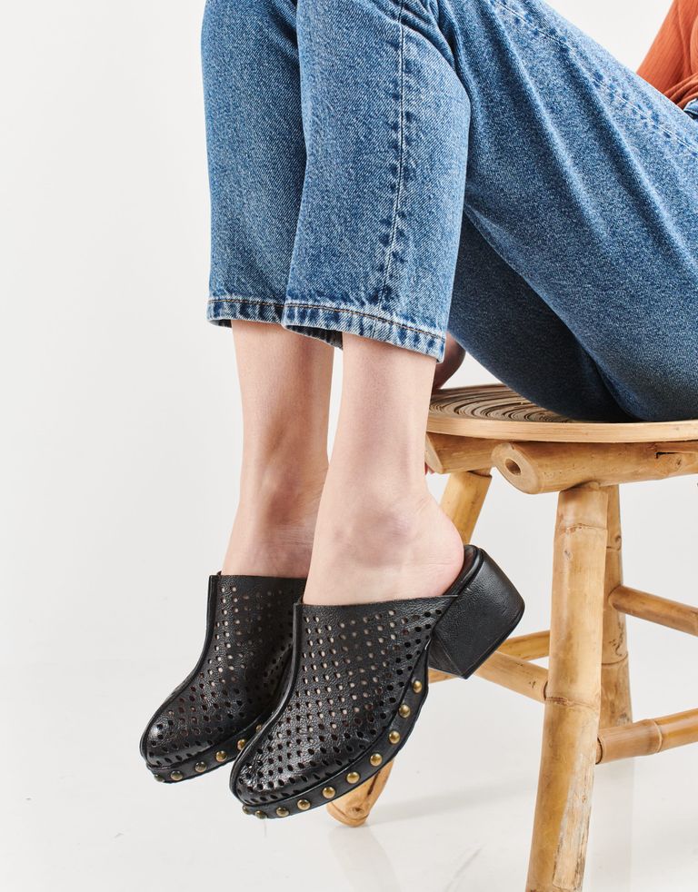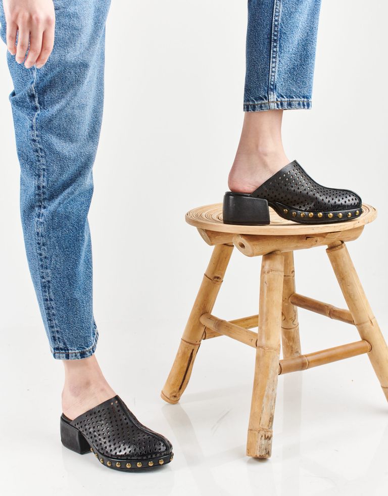 כפכפי עץ לנשים ברוח הסבנטיז עשויים עור רך בטקסטורה מחוררת. ניטים מעטרים את הסוליה הקדמית והכל נעשה בעבודת יד מוקפדת והכי איטלקית שיש.