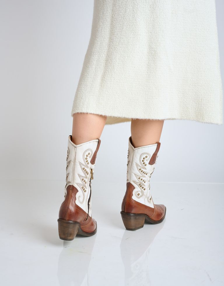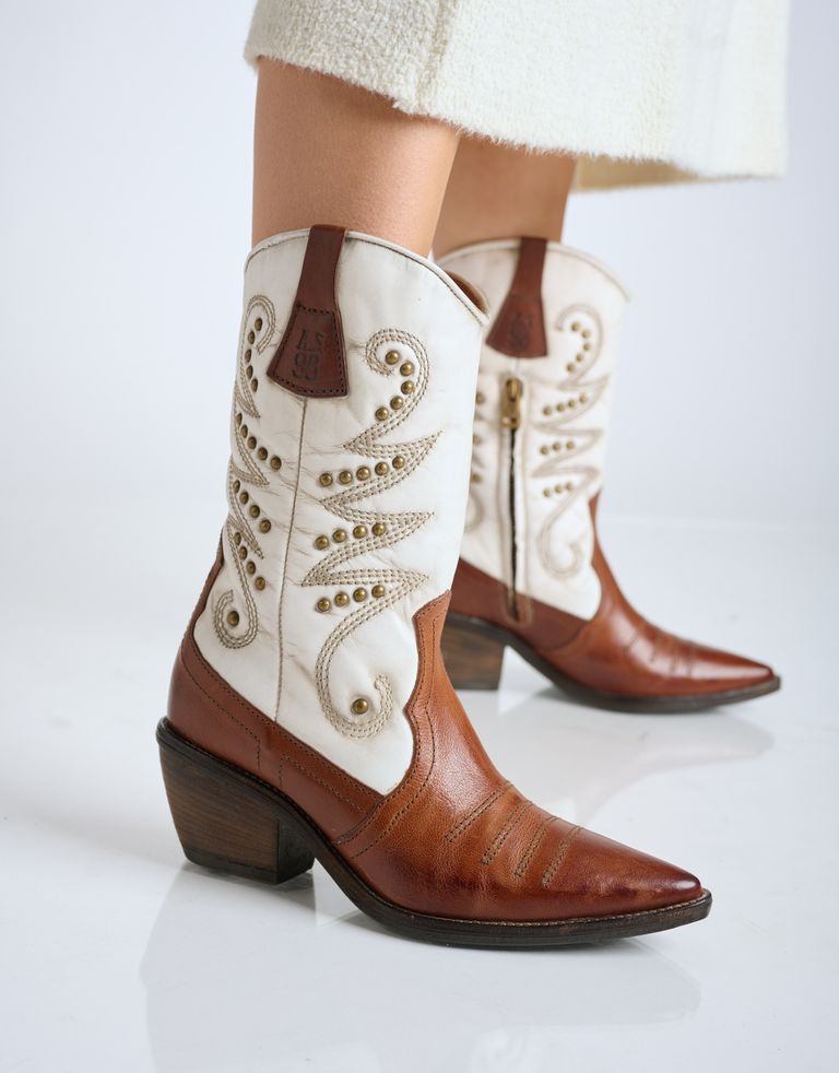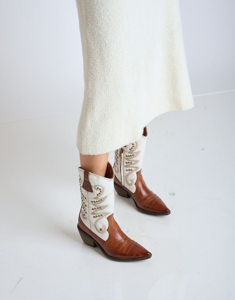 מגפי בוקרים בשילוב צבעים, תיפורים בולטים, ניטים ועקב רחב ויציב. המגפיים עשויים עור ומיוצרים בבית המלאכה המוקפד של AS. 98 באיטליה.