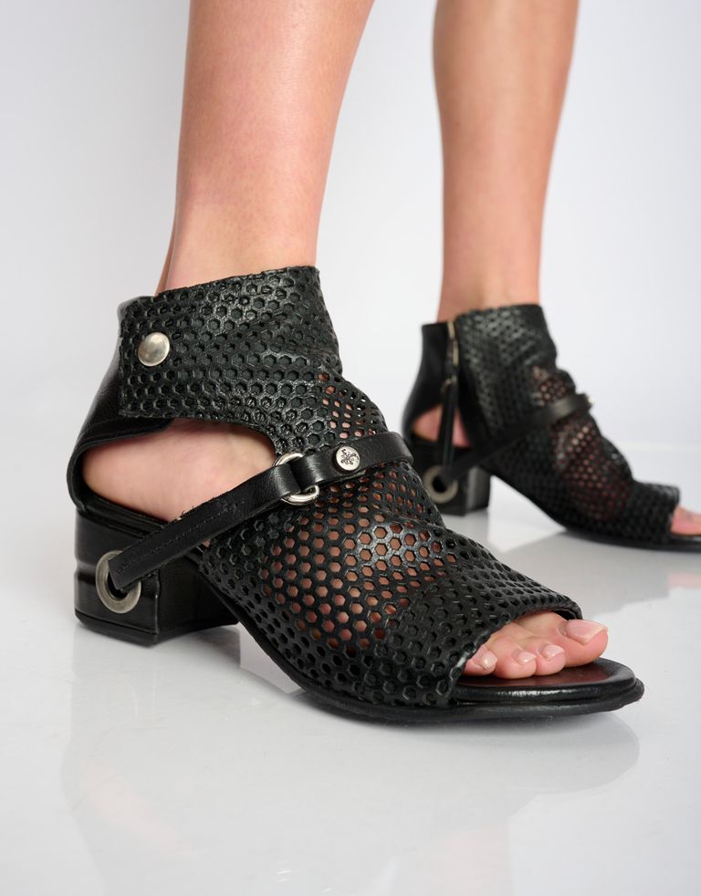 סנדלי עקב עם ניטים, לולאות מתכת, אבזמים ועקבים מלבניים מנצחים.