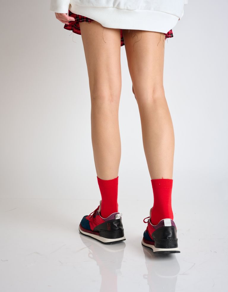 ממבט עילי – סניקרס זמש בגזרה קלאסית, ממבט צידי – סוליה עתידנית ומהפנטת, בשילוב טקסטורות של בד ניילון, עור, זמש.