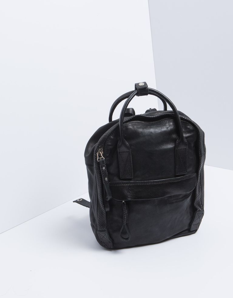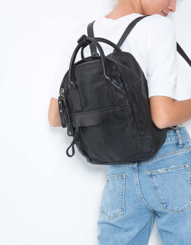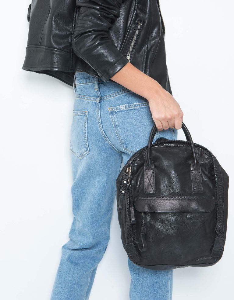 קטן וחכם: תיק גב מעור עם רצועות לנשיאה ביד, נסגר באמצעות רוכסן ומאובזר בשני תאים חיצוניים.