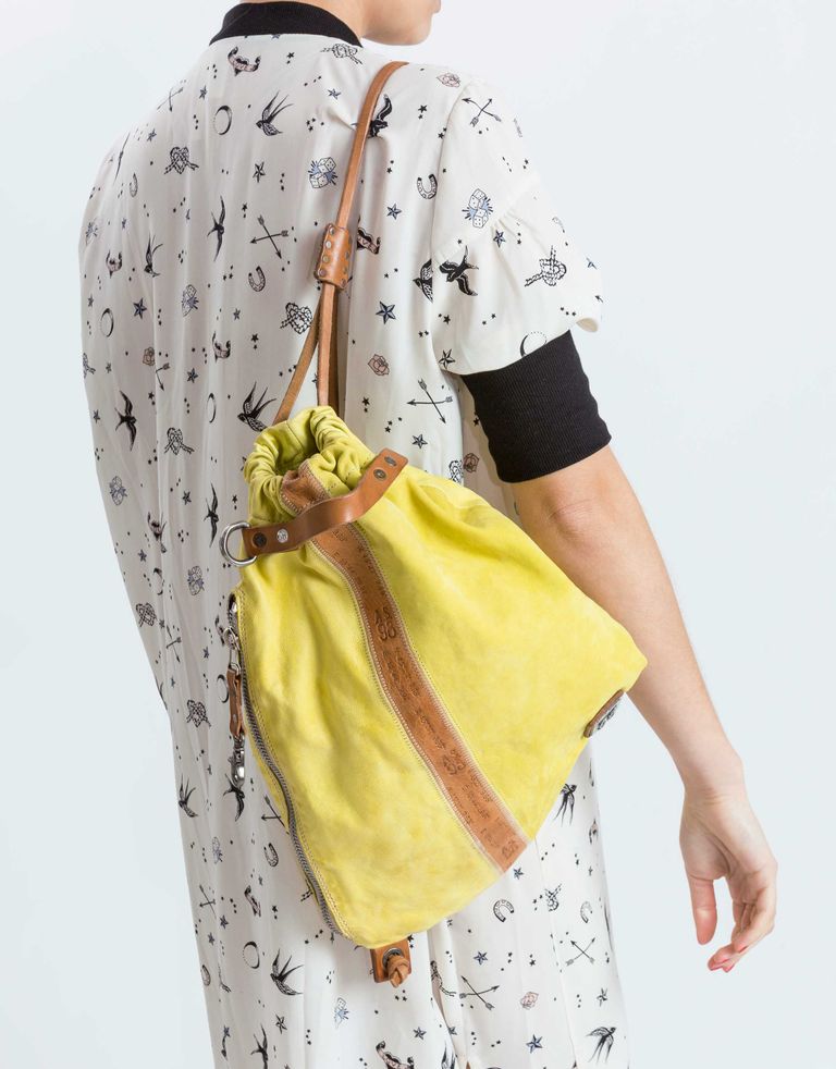 תיק גב מעור, נסגר באמצעות רוכסן צידי או כיווץ עליון. התיק בנוי מתא אחד מרכזי ומספר כיסים פנימיים, כולל כיס בסגירת רוכסן.