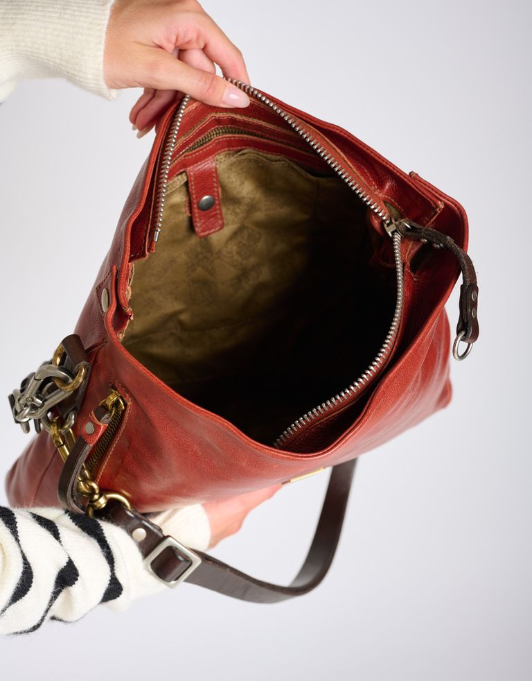 תיק קלאסי גדול עשוי עור. לתיק תא מרכזי עם כיסים פנימיים ותא חיצוני הנסגר עם רוכסן וגם שתי רצועות נשיאה מתכוננות.