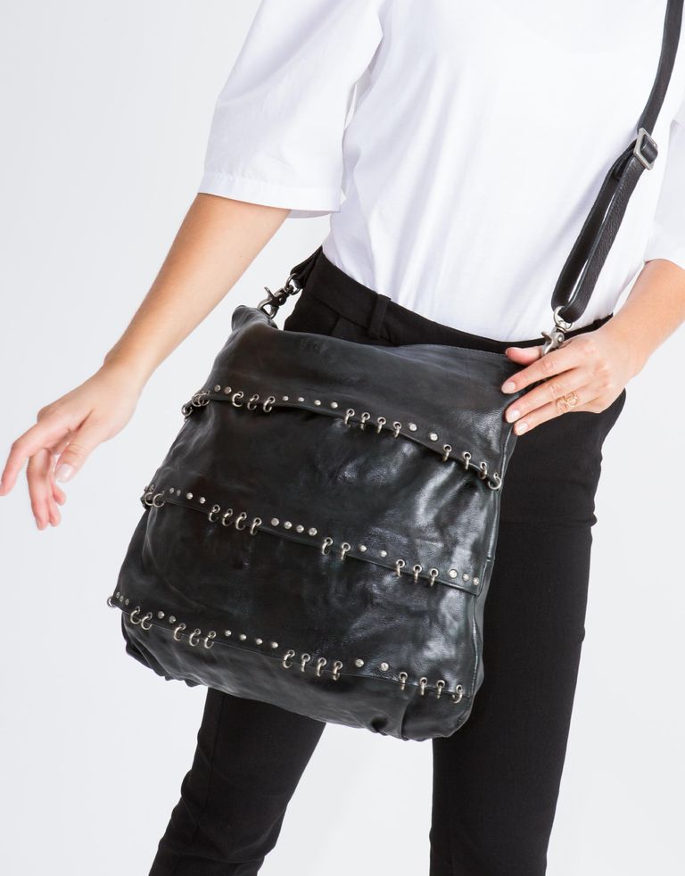 תיק צד גדול מעור עם לולאות מתכת קטנות וחינניות. בעל תא מרכזי מרווח, ארבע תאים קטנים וכיס פנימי עם רוכסן. כש-A.S. 98 מפנקים, ככה זה נראה.