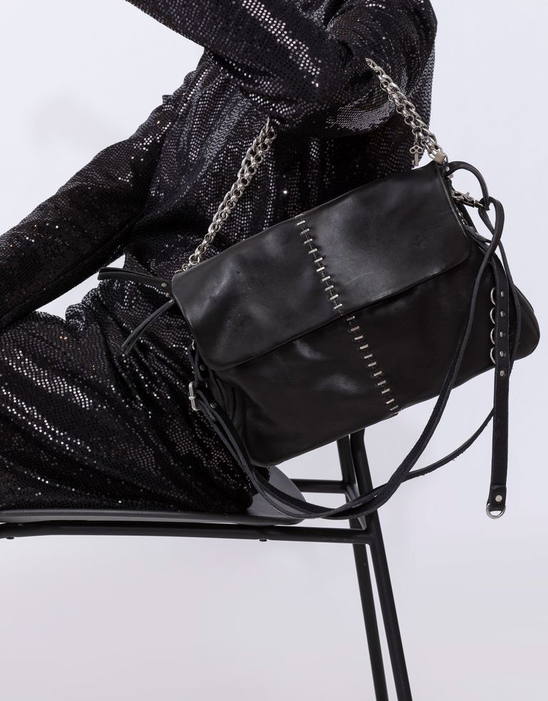 תיק שרשרת וסיכות, נותן מענה גם לצד של הגברת וגם לצד של הרוקנרול. עשוי עור בצביעה טבעית ומאובזר בדיטלייז מטאליים.