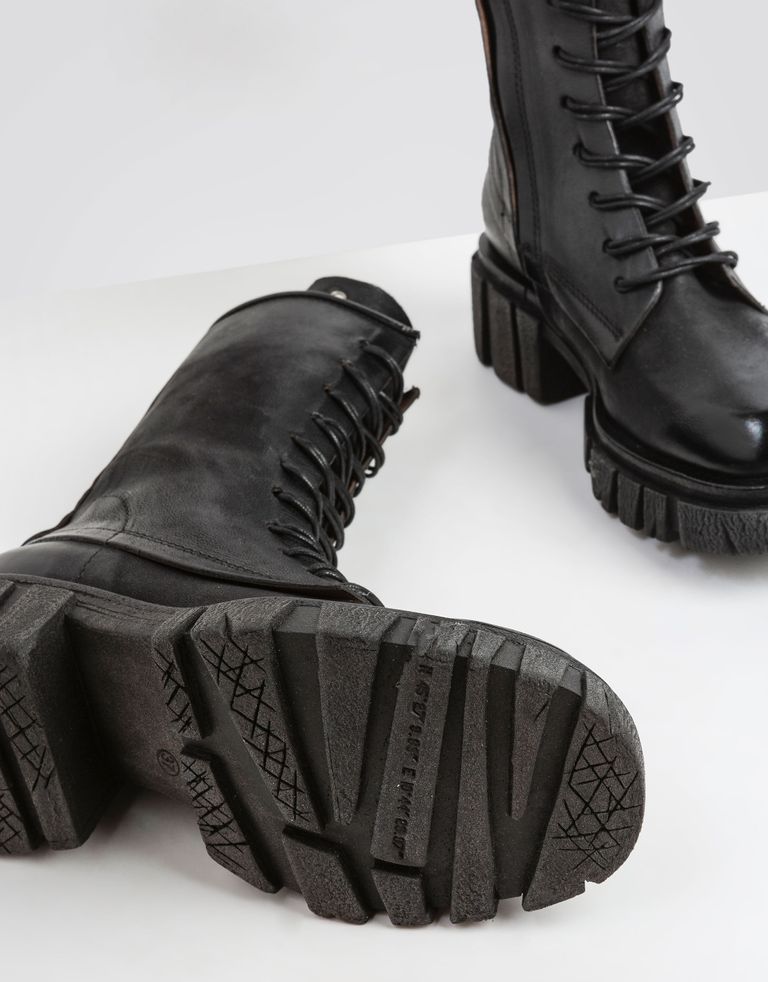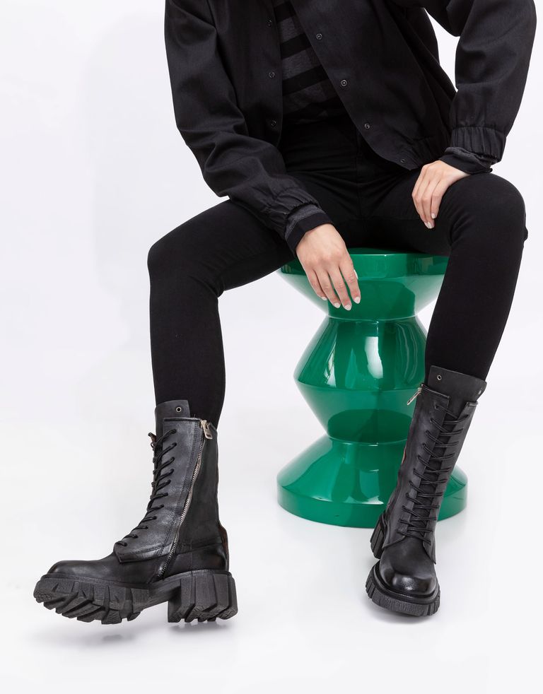 מגפיים עם שרוכים HELL, בהשראת נעלי צבא. המגפיים עשויים עור ומאובזרים בסוליה גסה וברוכסן פנימי לנעילה נוחה. לא מתנצלים וגם אין על מה.