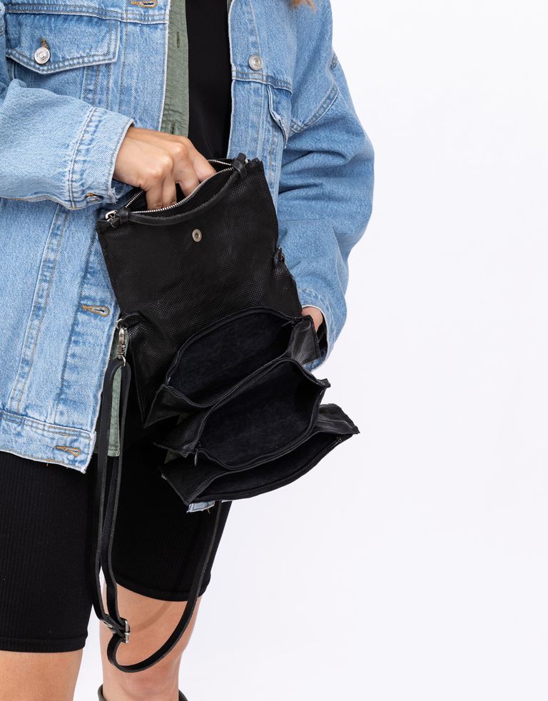 עשוי מחמישה כיסי עור נפרדים, כל אחד מהם נסגר באמצעות רוכסן. התיק מאובזר ברצועה נשלפת, שבהסרתה התיק הופך לקלאץ' ערב מקורי.