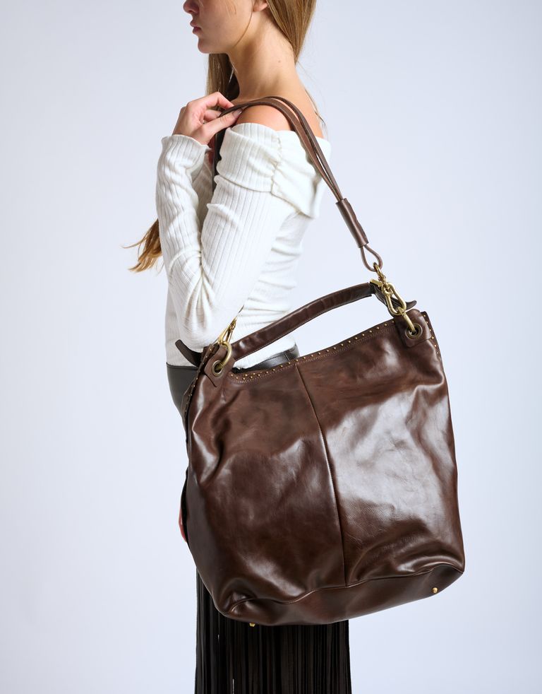 תיק צד גדול וגדוש באופי. עשוי מעור רך בגימור עבודת יד, משולב ניטים ותליונים. לתיק יש תא מרכזי גדול, רצועות צד מתכווננות ורצועת נשיאה רחבה.