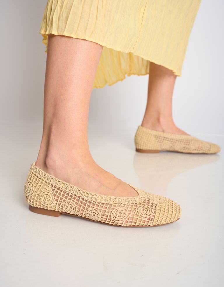 הנעליים עשויות מבד בטקסטורת יוטה עם עיטורים – קלאסיקה בעבודת יד.