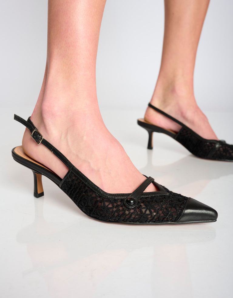 נעלי שפיץ עם עקב קיטן (Kitten Heels) ורצועה אחורית לאחיזה נוחה על הרגל. וייב של חופשה ביוון או עיירת חוף – גם כשאת רק בדרך לקפה.