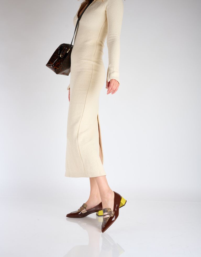 נעלי מוקסין מעור עם שפיץ בחרטום ששואלות אלמנטים מעולמות המוקסינים ויוצרות וריאציה חדשה ומקורית להפליא. הצבעים חורפיים, הטקסטורות אומנותיות והכל ביחד יפה מדי.