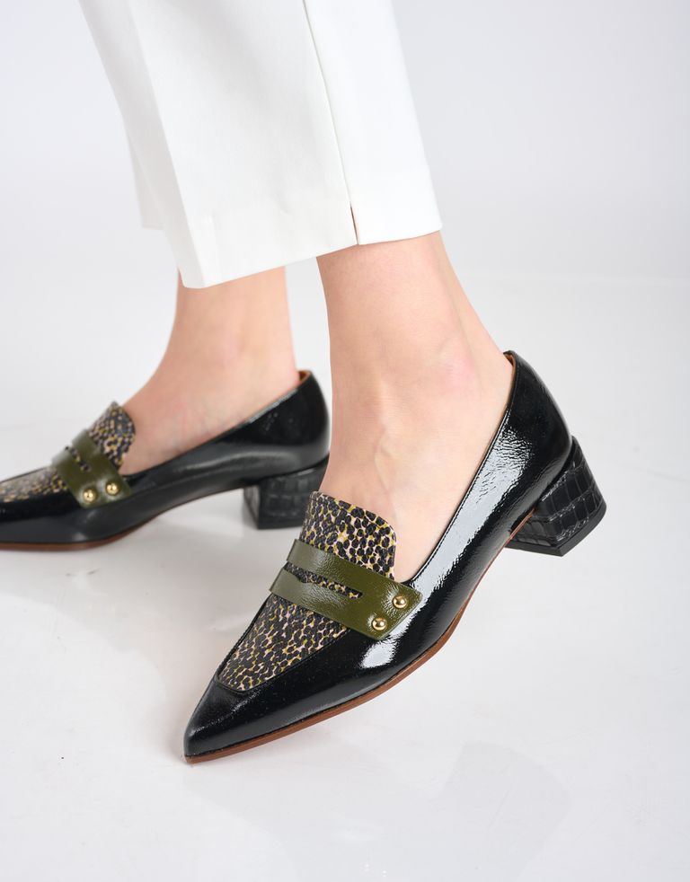 נעלי מוקסין מעור עם שפיץ בחרטום ששואלות אלמנטים מעולמות המוקסינים ויוצרות וריאציה חדשה ומקורית להפליא. הצבעים חורפיים, הטקסטורות אומנותיות והכל ביחד יפה מדי.