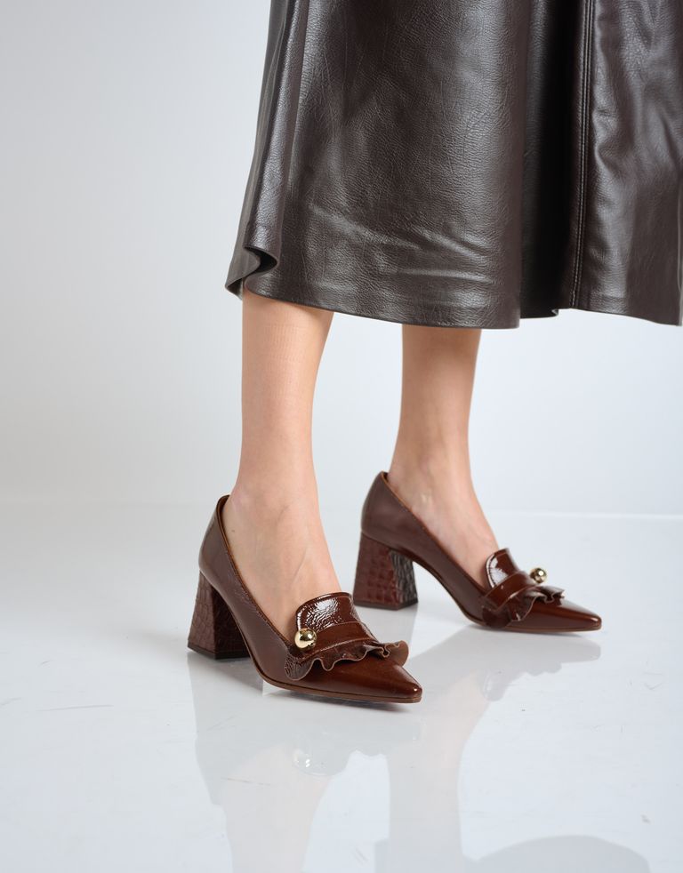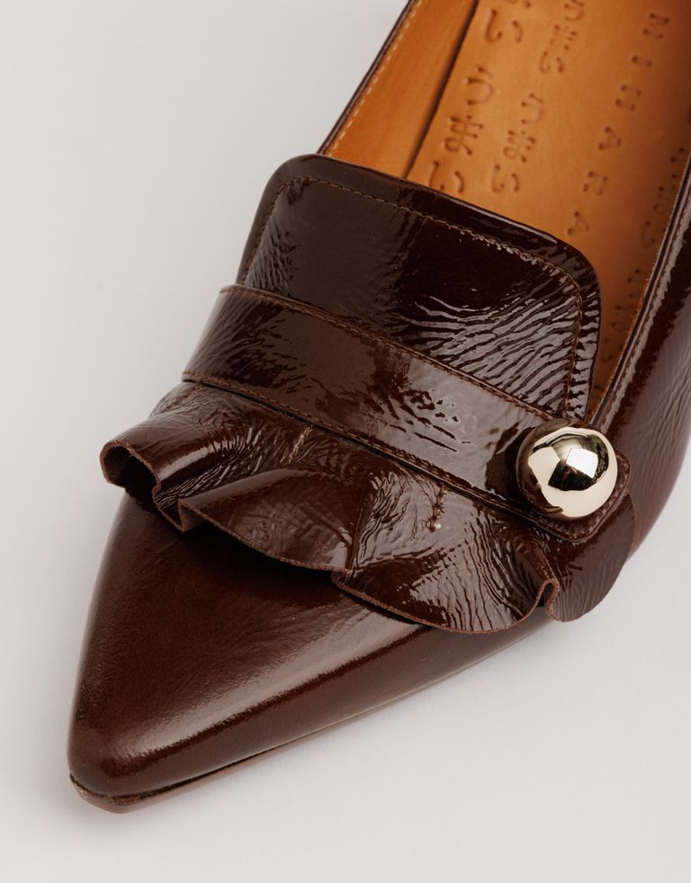 נעלי שפיץ מבריקות עם עקב רחב ודיטיילז רומנטי של מלמלה מעור. נעליים בצבעים חורפיים שמתחשק לנעול.