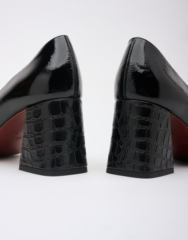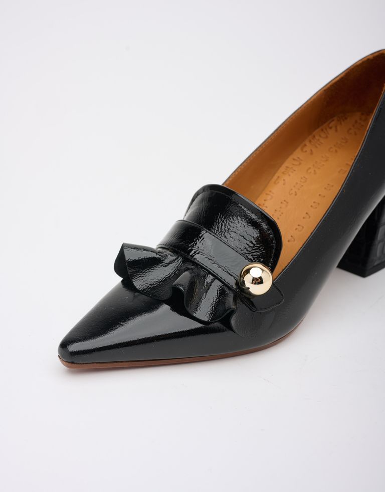 נעלי שפיץ מבריקות עם עקב רחב ודיטיילז רומנטי של מלמלה מעור. נעליים בצבעים חורפיים שמתחשק לנעול.