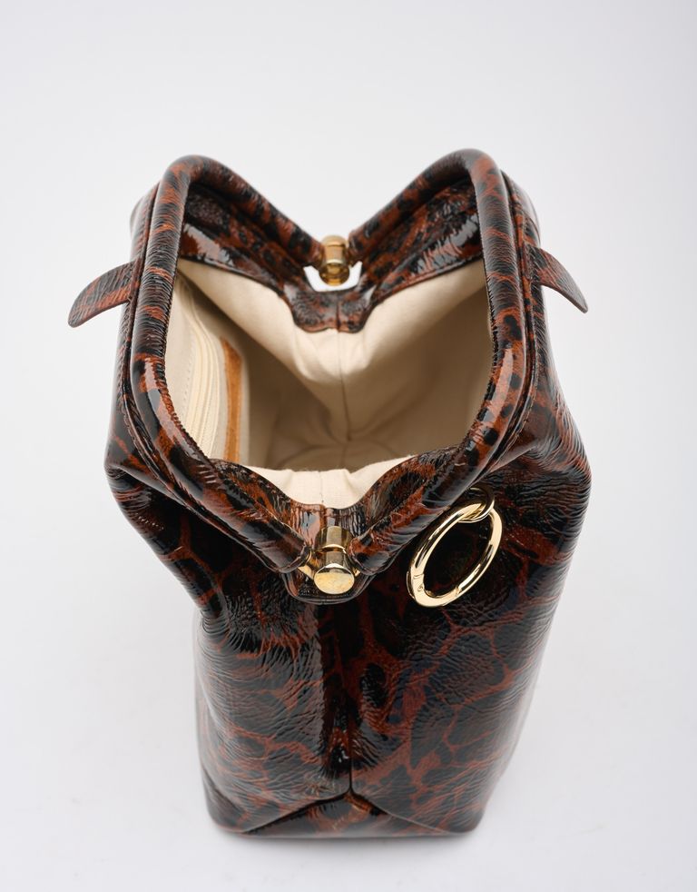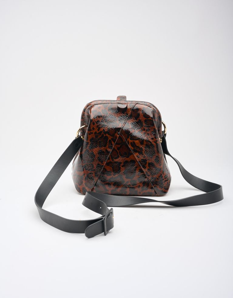 תיק צד עשוי עור משובח בטקסטורה מבריקה, הכי וינטג'י. התיק נסגר בנקישה, כמו תיקי הסבתות של פעם, ויש לו תא מרכזי וכיס פנימי. מגיע עם רצועת עור ארוכה ומתכווננת.
