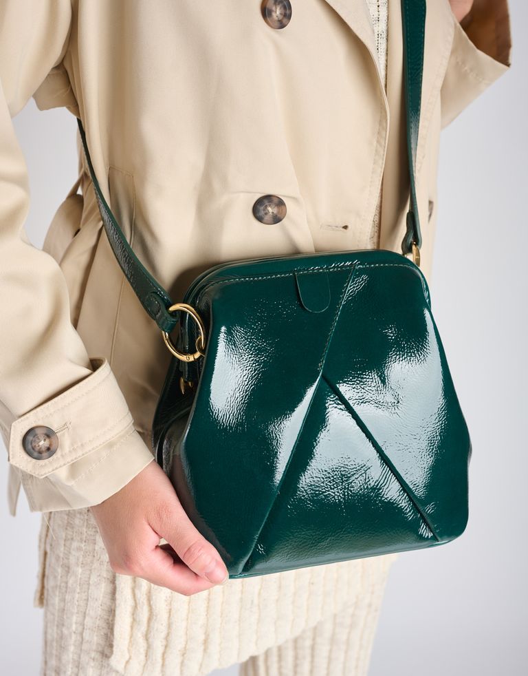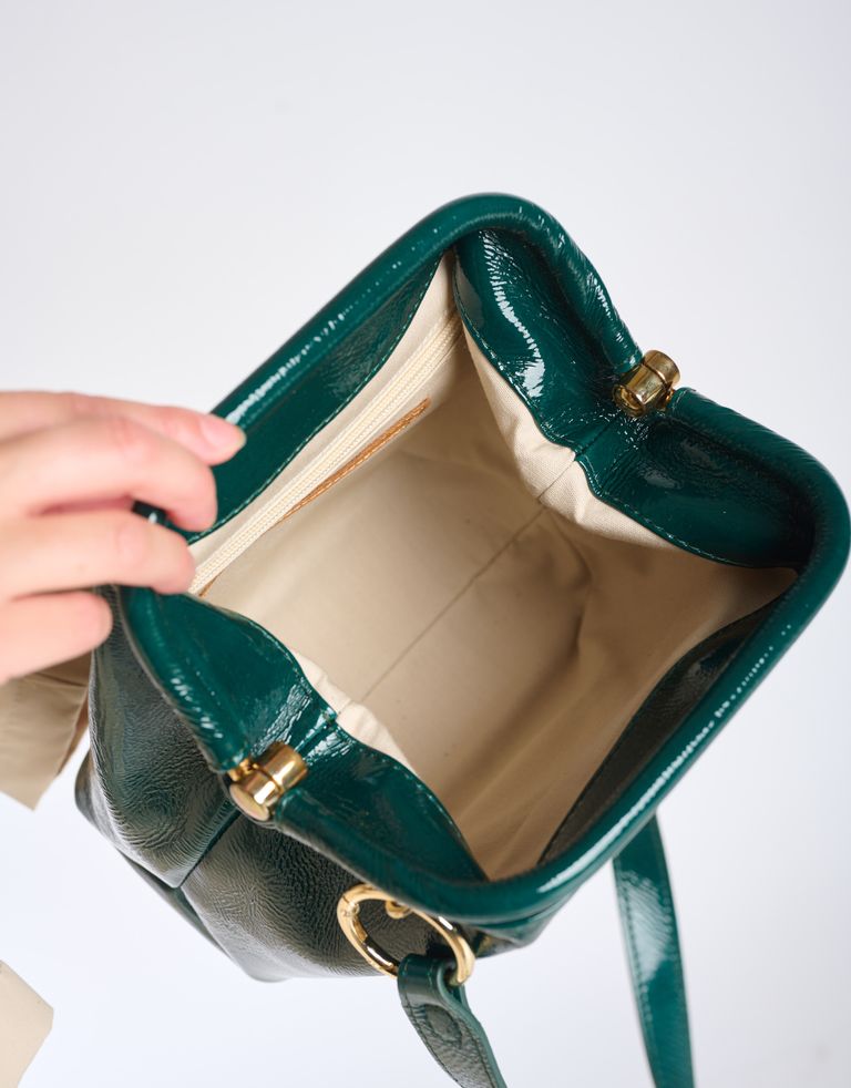 תיק צד עשוי עור משובח בטקסטורה מבריקה, הכי וינטג'י. התיק נסגר בנקישה, כמו תיקי הסבתות של פעם, ויש לו תא מרכזי וכיס פנימי. מגיע עם רצועת עור ארוכה ומתכווננת.