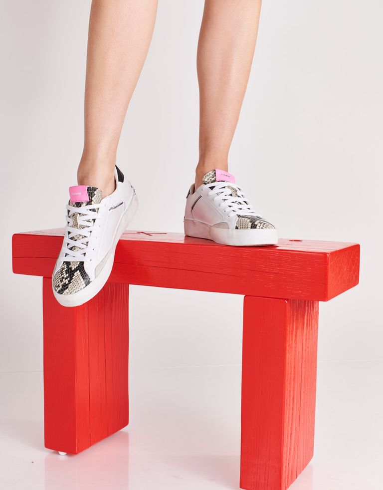 נעלי סניקרס מעור איטלקי משובח בשילוב נצנצים, טקסטורות, טלאים, שני ניטים מאחור וכיתוב "DESTRESSED WITH "NO STRESS על הגפה. הכי רוקנרול.