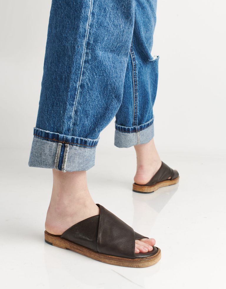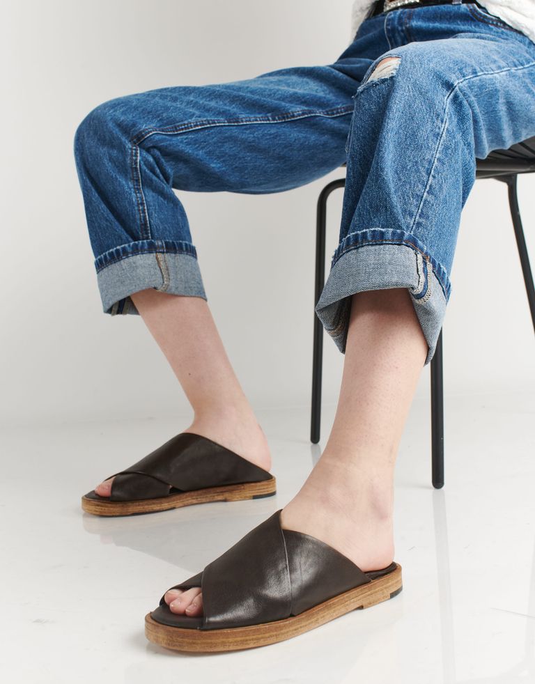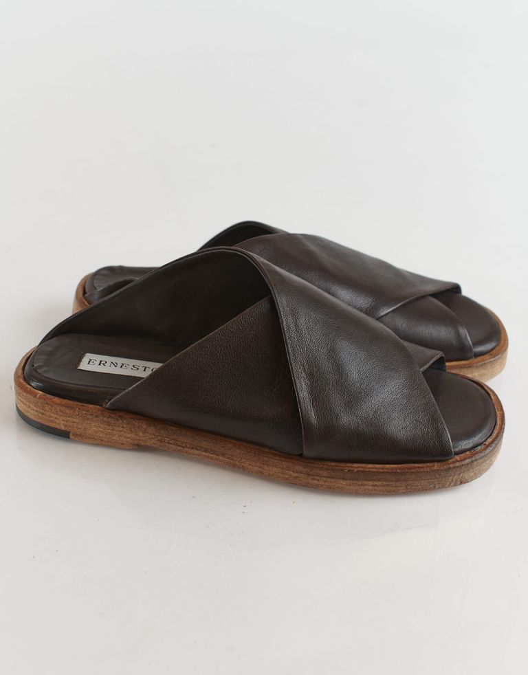 כפכפים שטוחים המעוצבים משתי רצועות עור רחבות. הכי קלאסי, הכי ארנסטו דולאני.