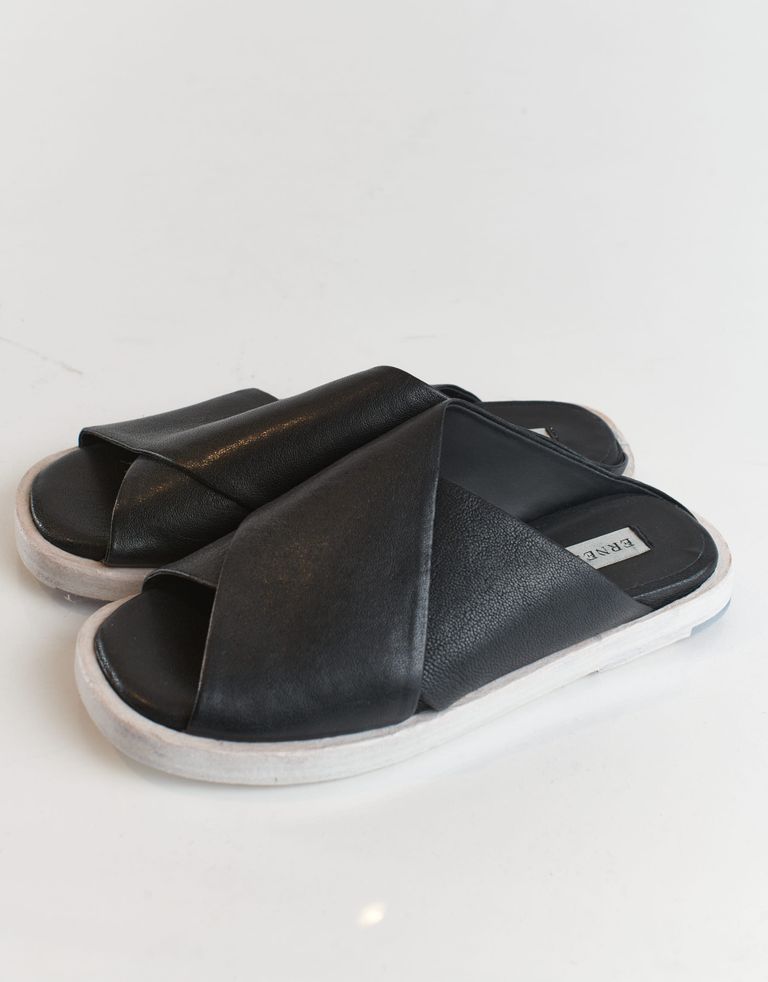 כפכפים שטוחים המעוצבים משתי רצועות עור רחבות. הכי קלאסי, הכי ארנסטו דולאני.