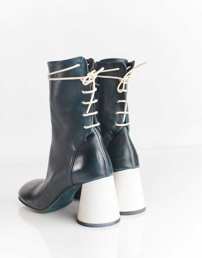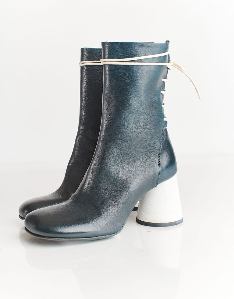 מגפיים מעור המגיעים עד אמצע השוק עם עקב צ'אנקי ולא שגרתי. למגפונים סגירת רוכסן צידית וכן קשירת שרוכים אחורית הניתנת להתאמה אישית. אלגנטיות ומלאות אופי, בדיוק כמו שצריך.