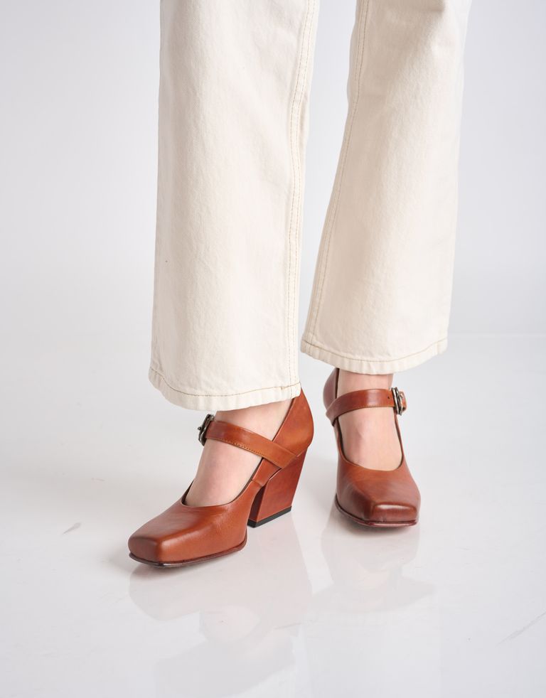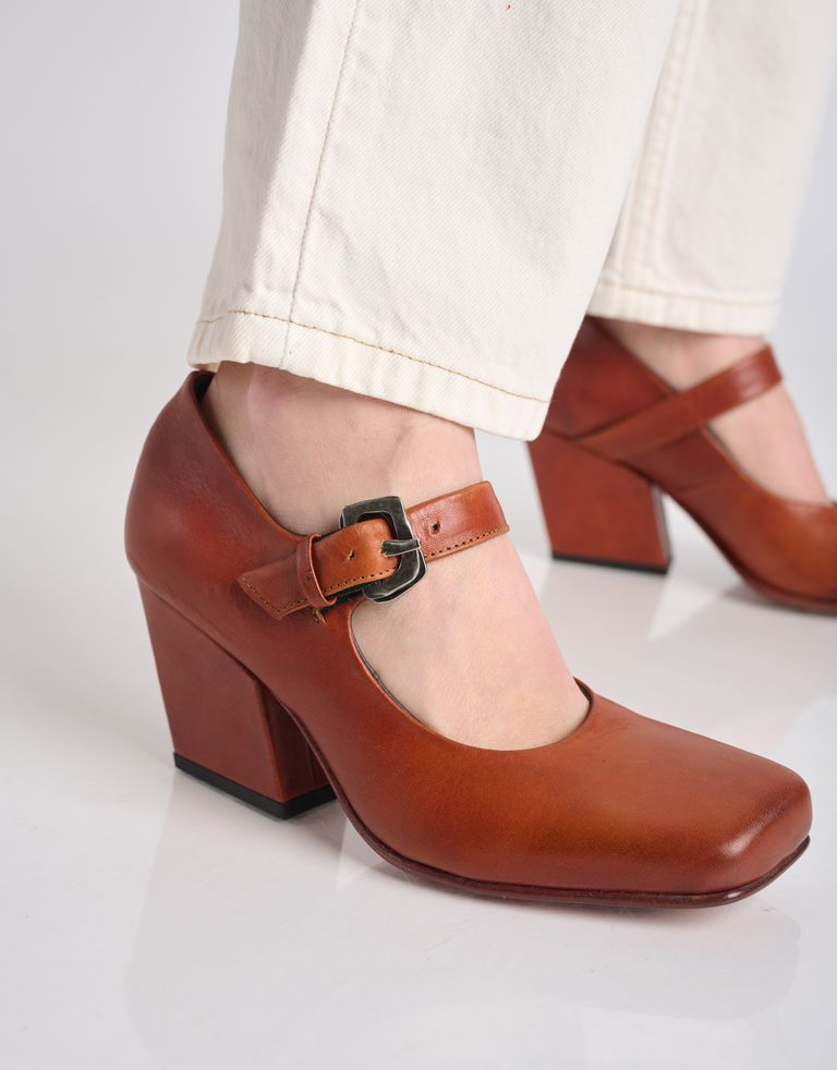 נעלי מרי ג׳יין עם טוויסט בצורת עקב עבה ומשופע בסגנון בוקרים וסגירת אבזם, טייק מחוספס על המרי ג׳יין הקלאסיות.