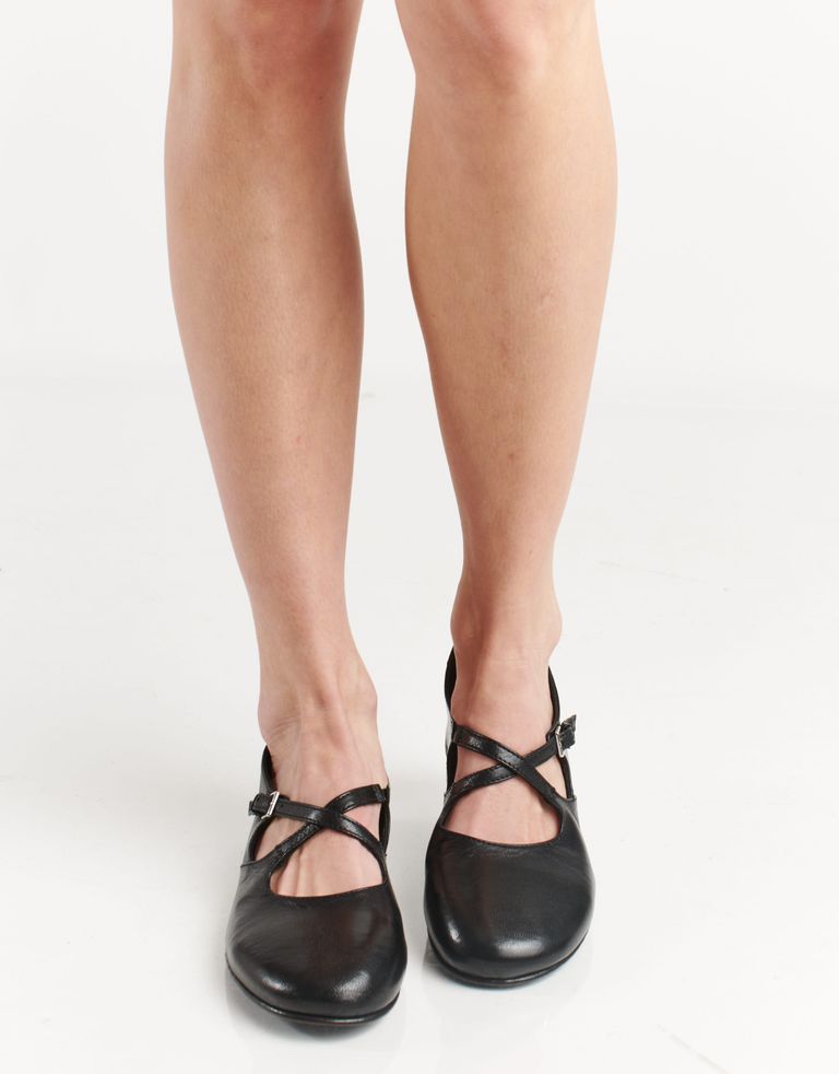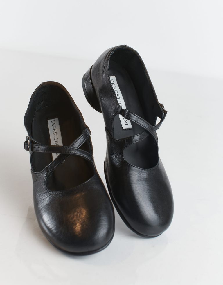נעלי עור עם חרטום מעוגל, מאובזרות בעקב קטן ונסגרות באמצעות אבזם. נעלי נשים אלגנטיות ומדויקות, בראוויסימו ארנסטו.