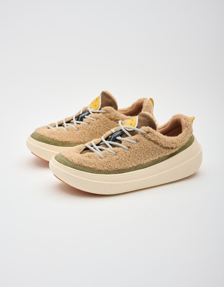 סניקרס בגזרה נמוכה עם גפת צמר מסולסל למראה חורפי ומוקפד. שרוכים בהשראת נעלי טיפוס וסוליית גומי עם קווים מודגשים היוצרים נעליים עם נוכחות.