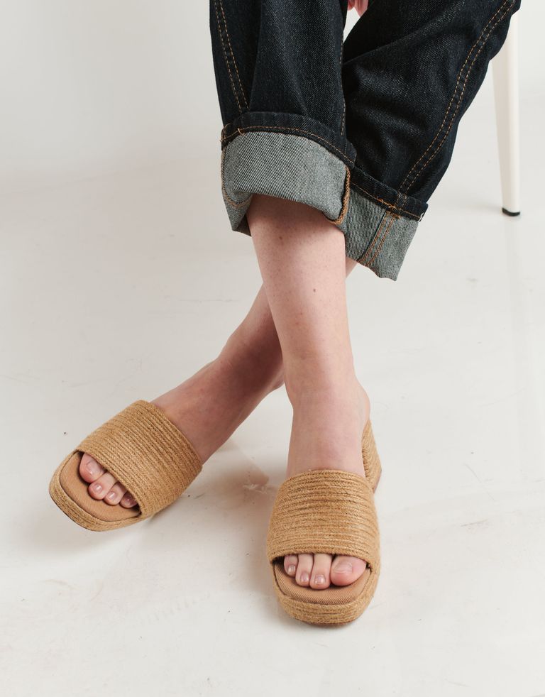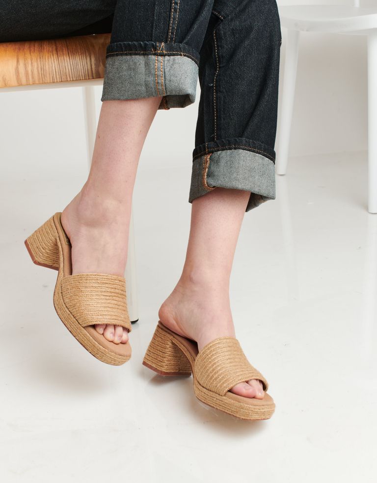 כפכפים גבוהים מכוסים בבד יוטה, עם עקבים בגובה מדויק להפליא