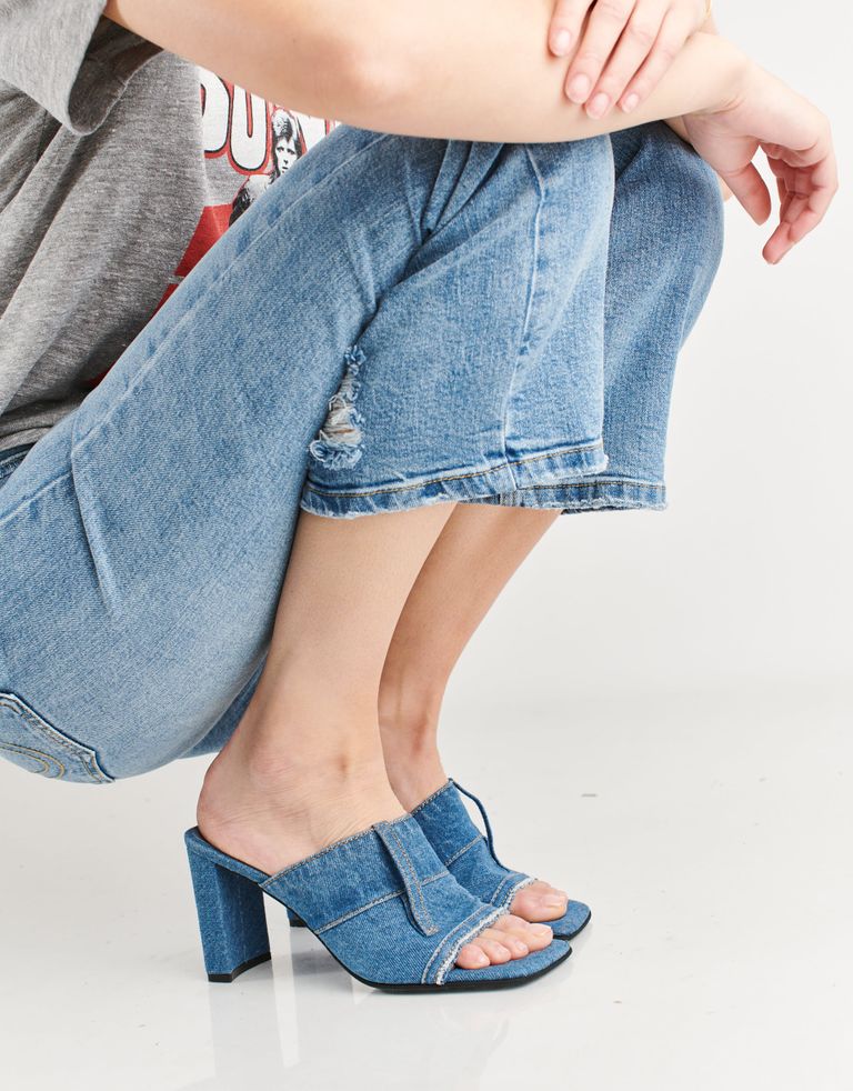 כפכפים גבוהים מכוסים בבד ג'ינס, כולל רצועה קטנה לחגורה. שיהיה, ג'אסט אין קייס.