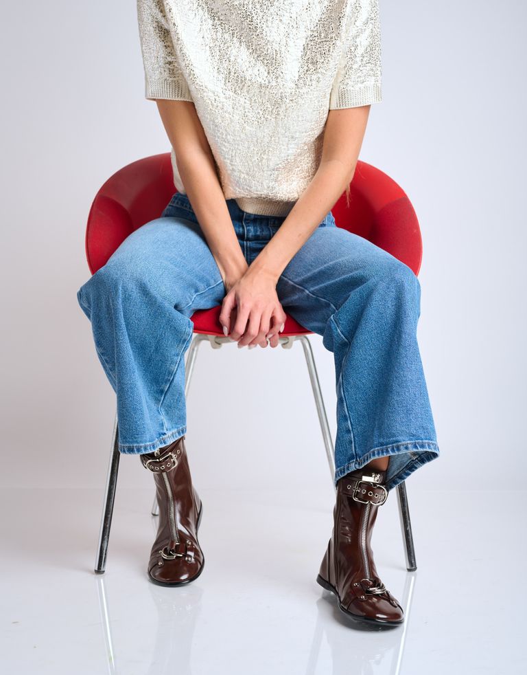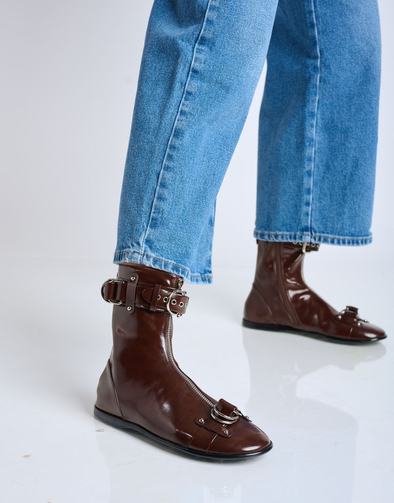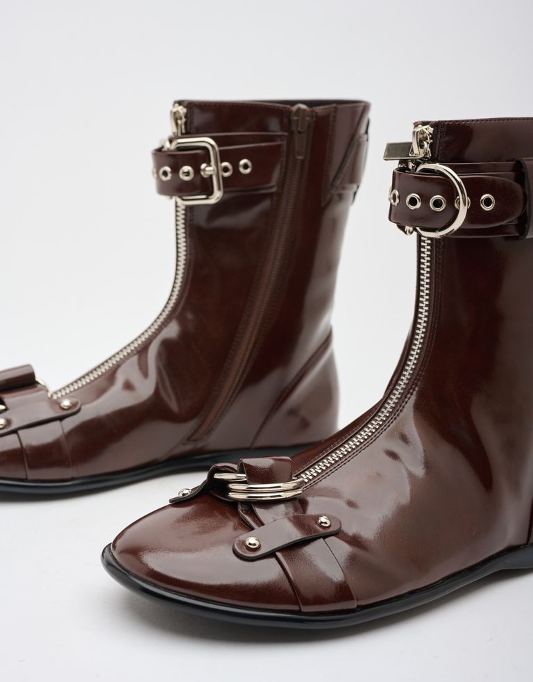 מגפונים דמויי עור שטוחים וקרובים לקרקע בעיצוב מקורי ופאשן פורוורד. למגפיים חרטום עגול, רוכסן קדמי (רק ליופי) ושילוב רצועות ואבזמים, כי למה לא בעצם?