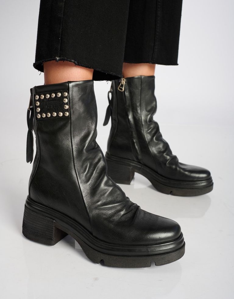 מגפונים בסגנון בוקרים שעשו רגע סיבוב מהמערב הפרוע וקפצו לשיעור גיאומטריה עם עקב מרובע, טבעת מתכת וניטים עגולים.
