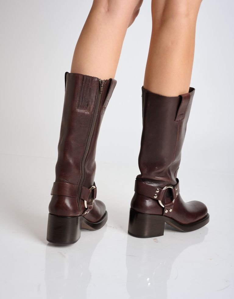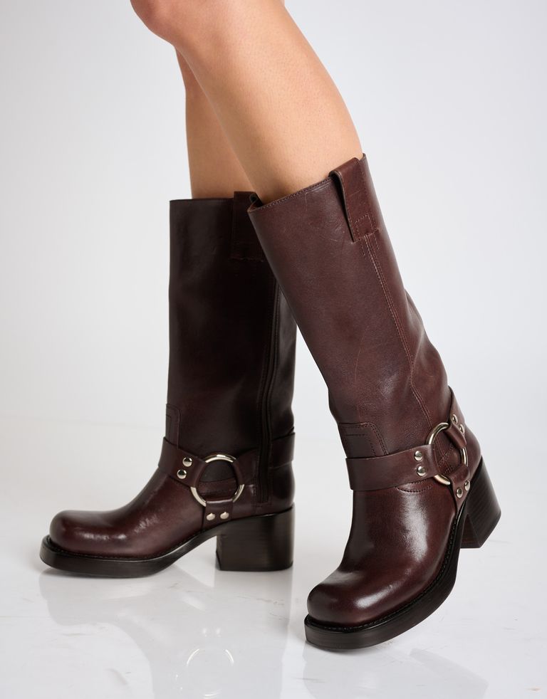 מגפי עור גבוהים במראה מחוספס עם עקב צ׳אנקי ואבזם. פריט חובה בארון החורפי.