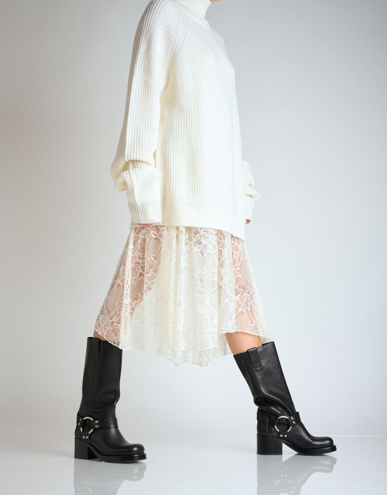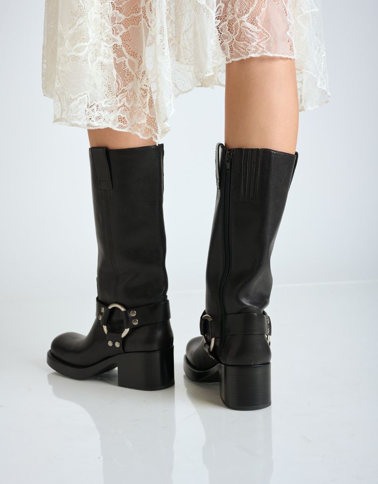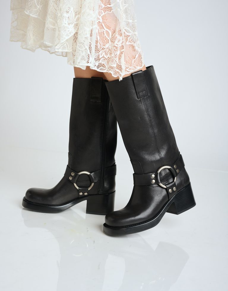 מגפי עור גבוהים במראה מחוספס עם עקב צ׳אנקי ואבזם. פריט חובה בארון החורפי.
