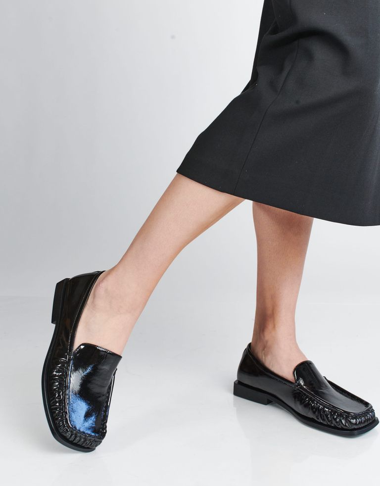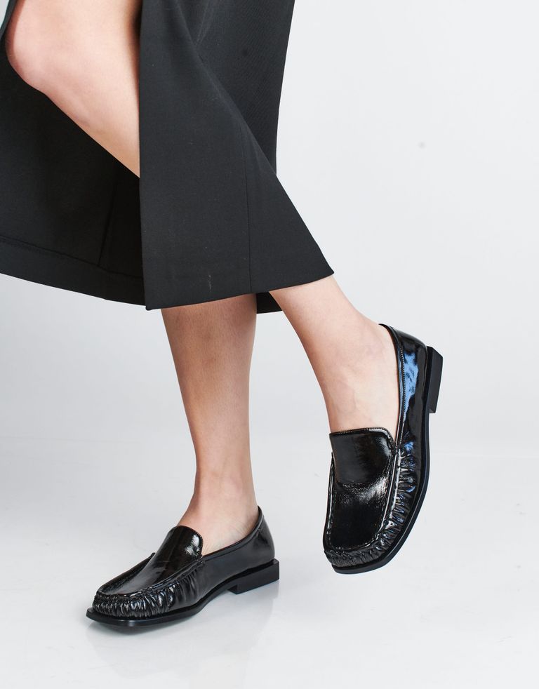 נעלי לואפרס לנשים, עיצוב קלאסי עם חרטום מרובע מקדימה וטקסטורה מבריקה. כן, ג'פרי קמפבל שוב הבריק.
