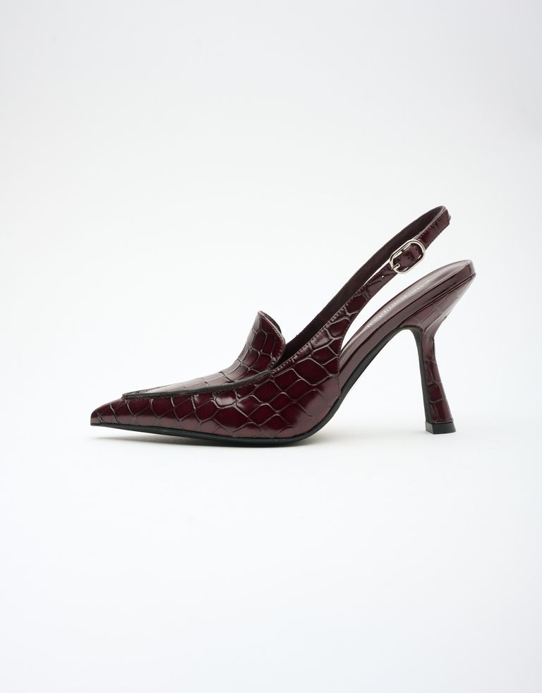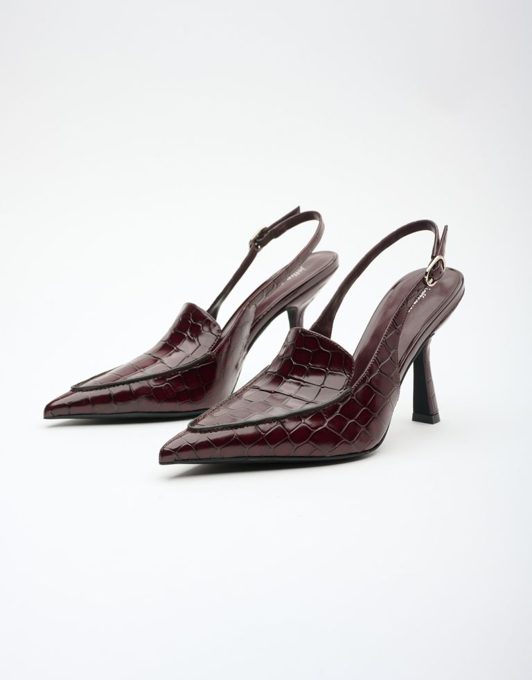 נעליים בטקסטורה מנוחשת, עם חרטום מחודד. נעלי סירה עם עקב סטילטו גבוה ורצועה דקה הנסגרת עם אבזם.