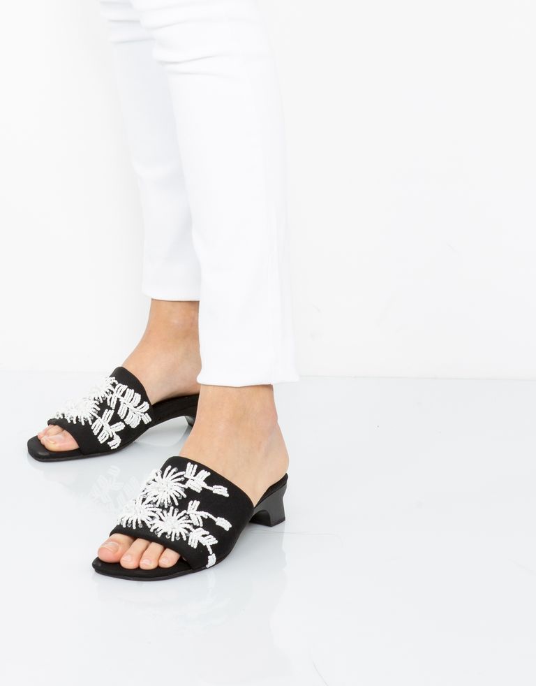 כפכפים פתוחים מסאטן, מקושטים בעיטורי חרוזים משמחים.