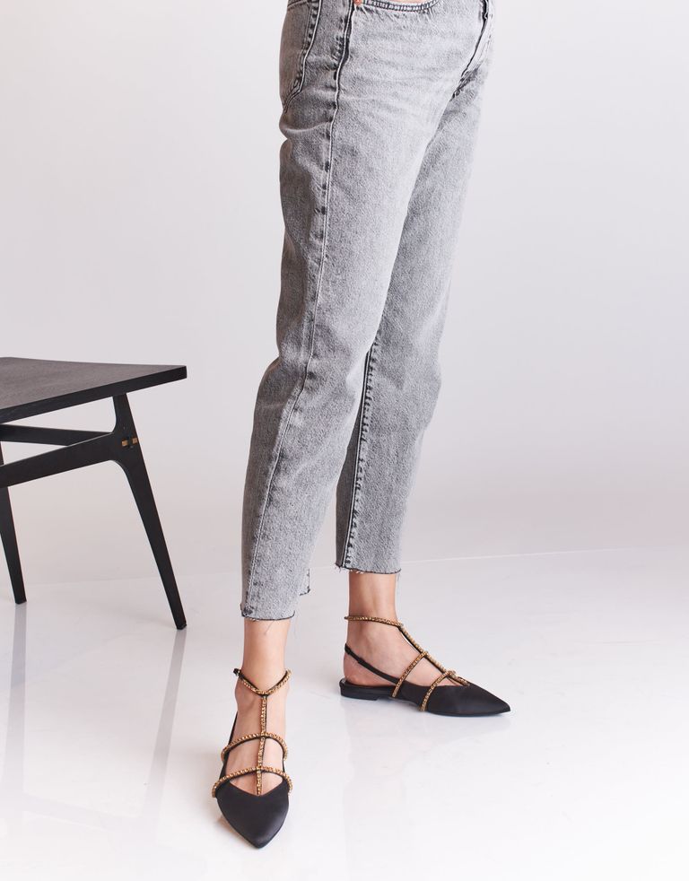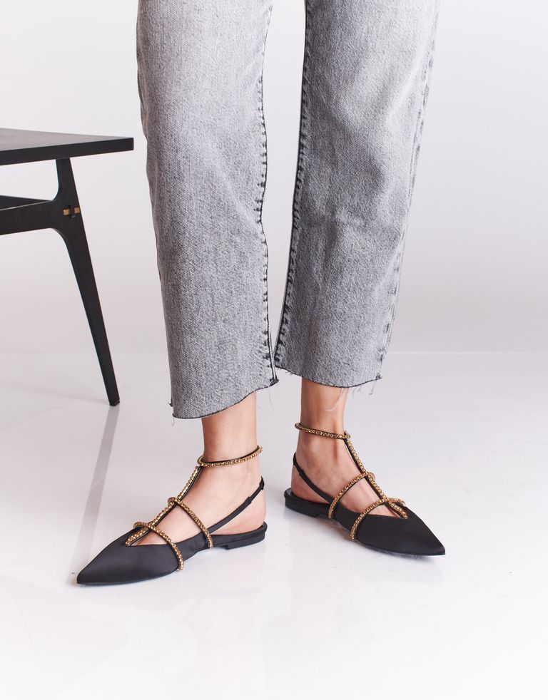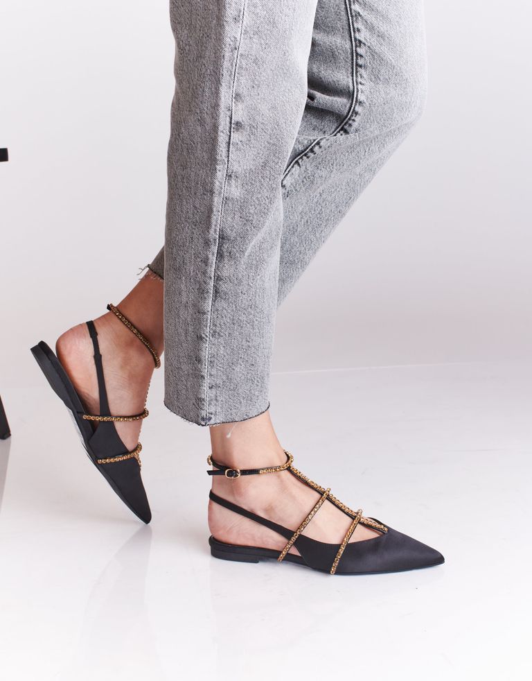 נעליים המייצגות מגמה חדשה של עולם האופנה – נעליים היברדיות, שהן גם וגם – נעלי סירה וגם סנדלים. גפת הנעליים המחודדת עשויה סאטן, על רצועות הסנדלים אבנים מנצנצות. קצת בלינג אף פעם לא מזיק.