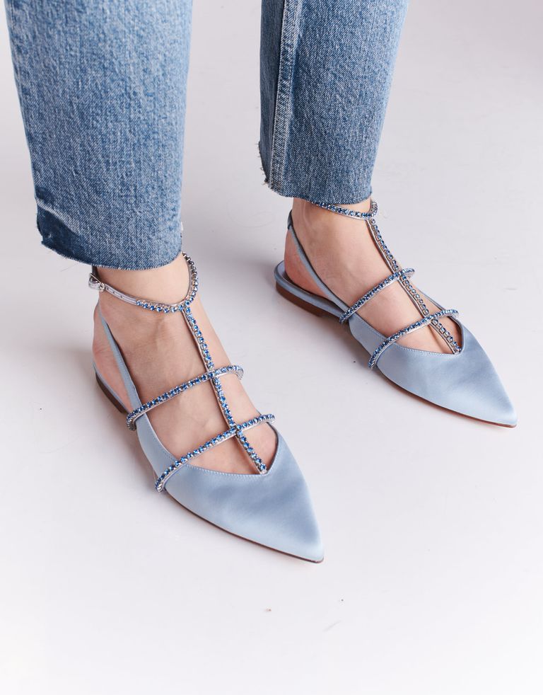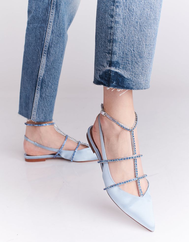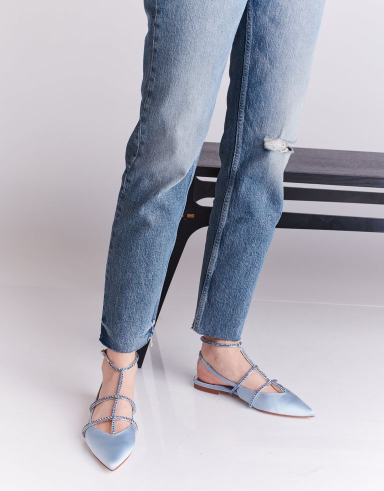 נעליים המייצגות מגמה חדשה של עולם האופנה – נעליים היברדיות, שהן גם וגם – נעלי סירה וגם סנדלים. גפת הנעליים המחודדת עשויה סאטן, על רצועות הסנדלים אבנים מנצנצות. קצת בלינג אף פעם לא מזיק.