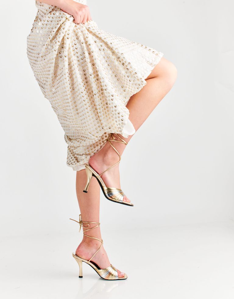 סנדלים גבוהים עם עקב סטילטו ורצועות קשירה פרי-סטייל. לנעול ולהרגיש כמו קיילי מינוג בשיא שלה. ספינינג אראונד פוראבר.