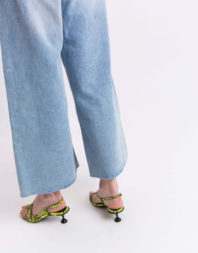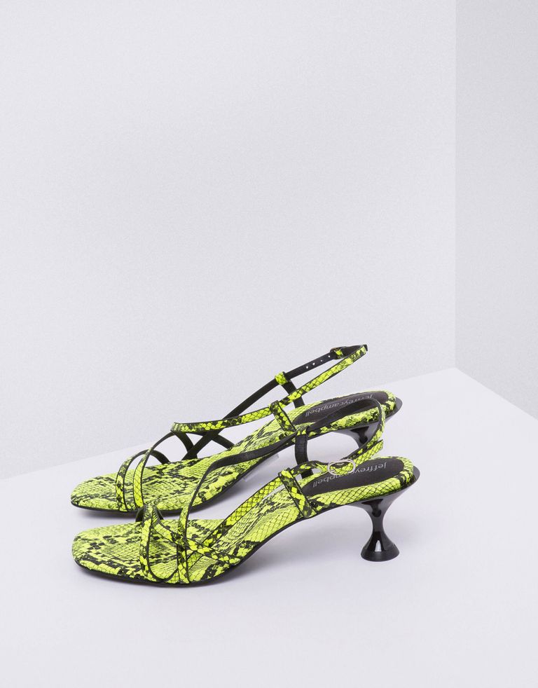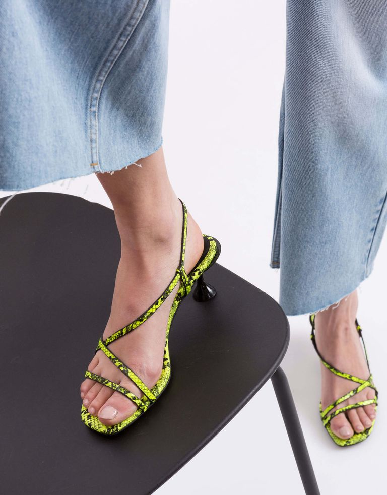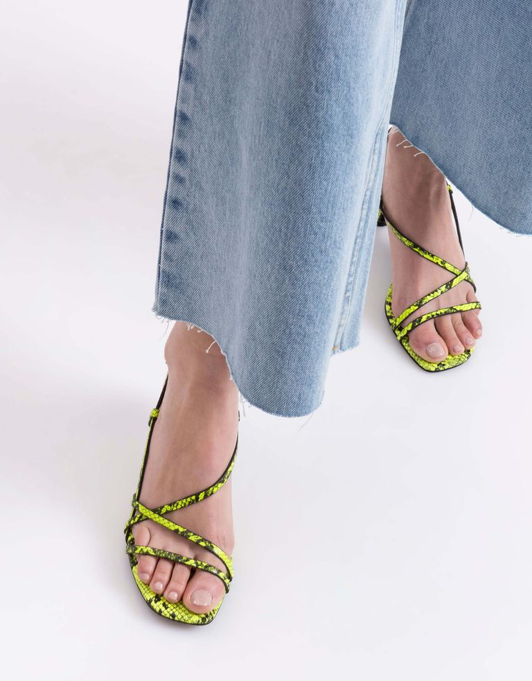 סנדלי עקב (הם בגובה מצוין), מאובזרים ברצועות דקיקות בפרינט נחש.