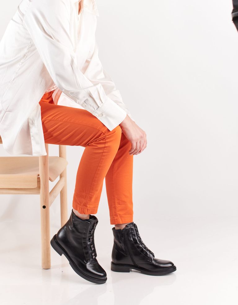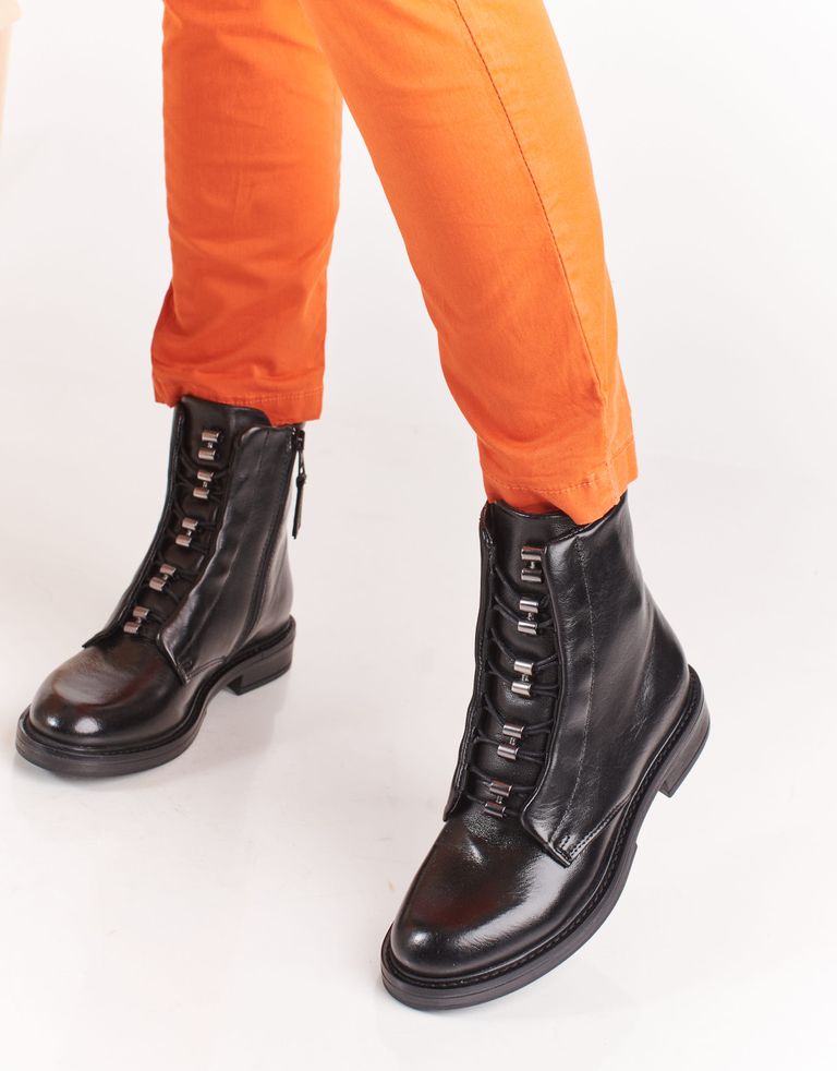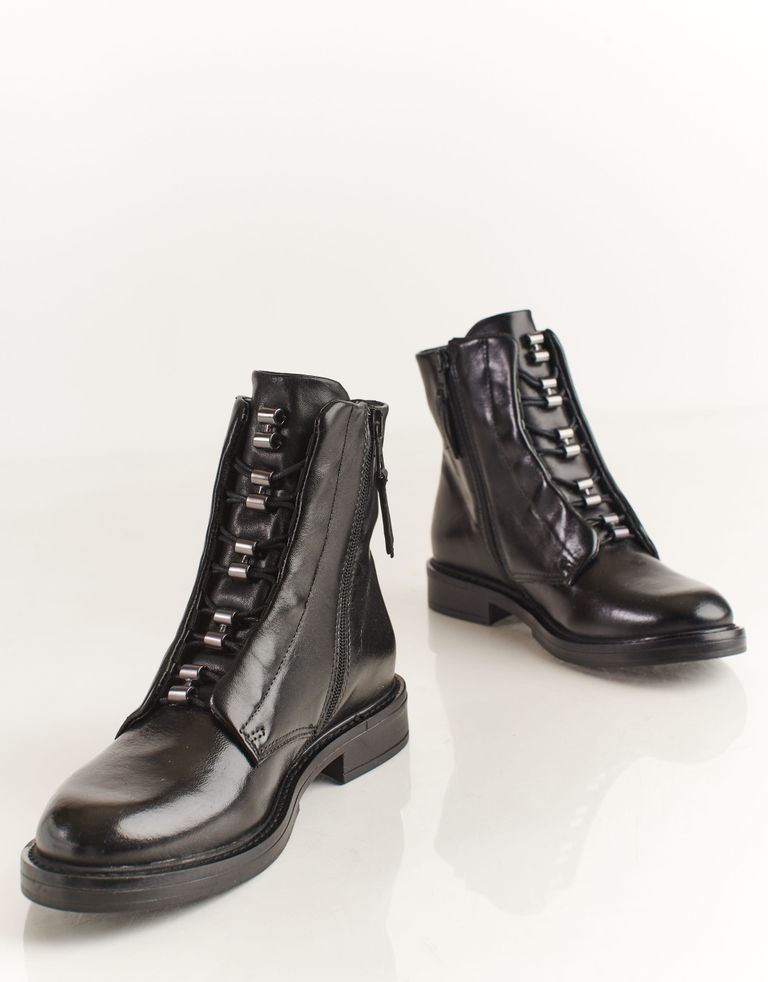 מגפוני עור עם קשירת שרוכים, חרטום מעוגל, עקב נמוך וסגירת רוכסן צידית. שיהיה, ג'אסט אין קייס.