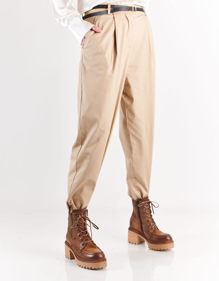 מגפונים מעור בסגנון מגפי הרים עם קשירת שרוכים ורכיסה צידית. למגפיים סוליה צ'אנקית ועקב גבוה.