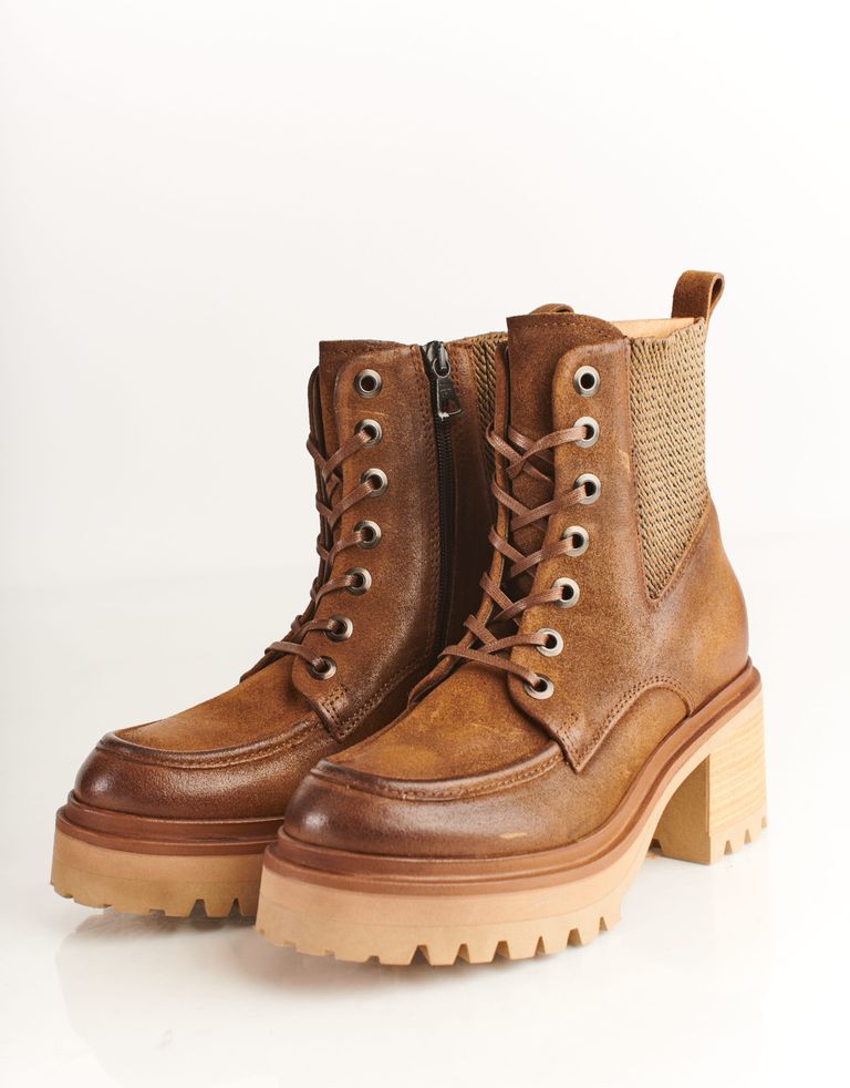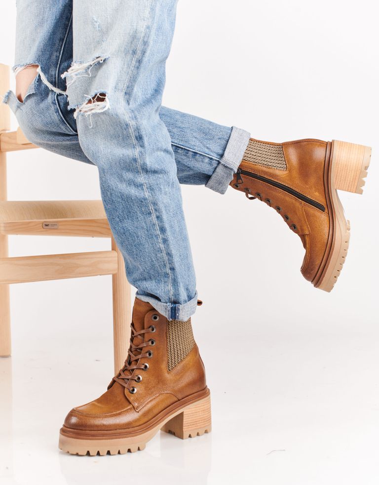 מגפונים מעור בסגנון מגפי הרים עם קשירת שרוכים ורכיסה צידית. למגפיים סוליה צ'אנקית ועקב גבוה.