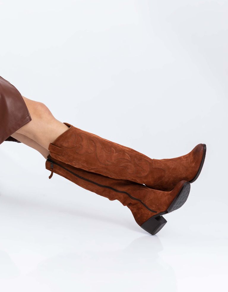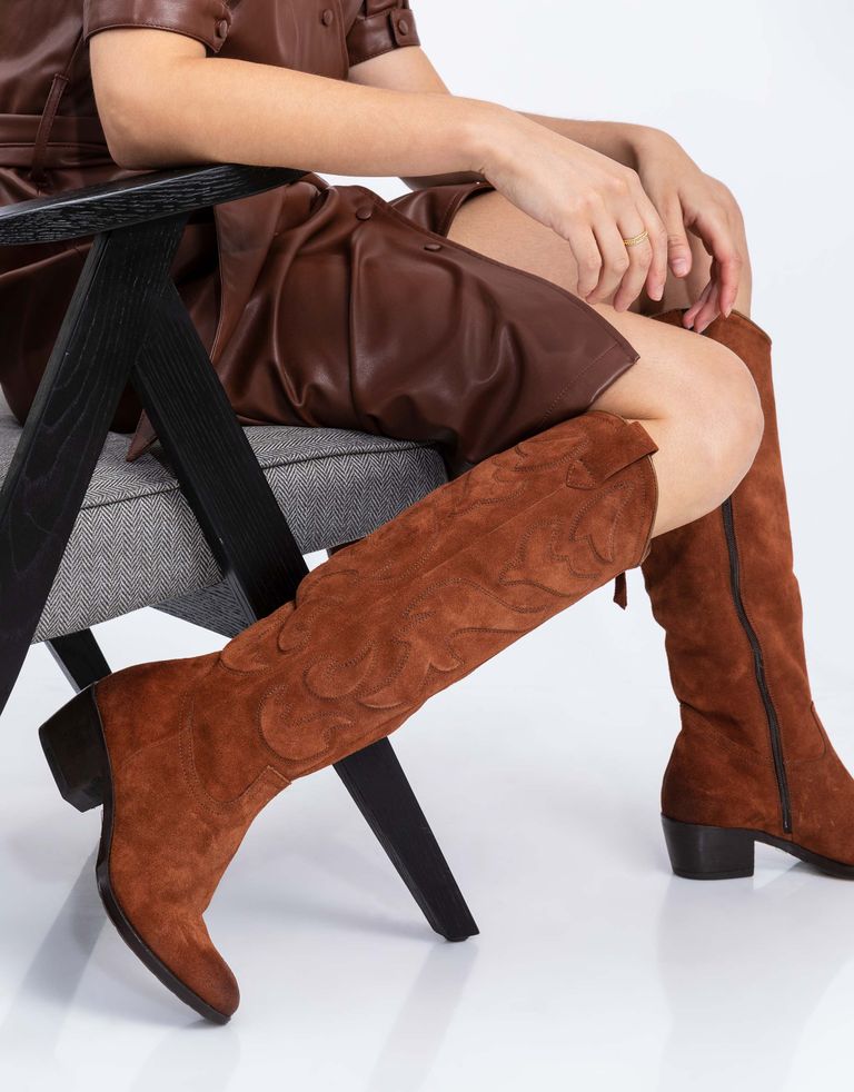 מגפי עור גבוהים עם עיטורים רקומים בסגנון שמרפרר למגפי בוקרים, אבל בתוספת גוון של עדינות. בינינו, מגפי חורף מושלמים.