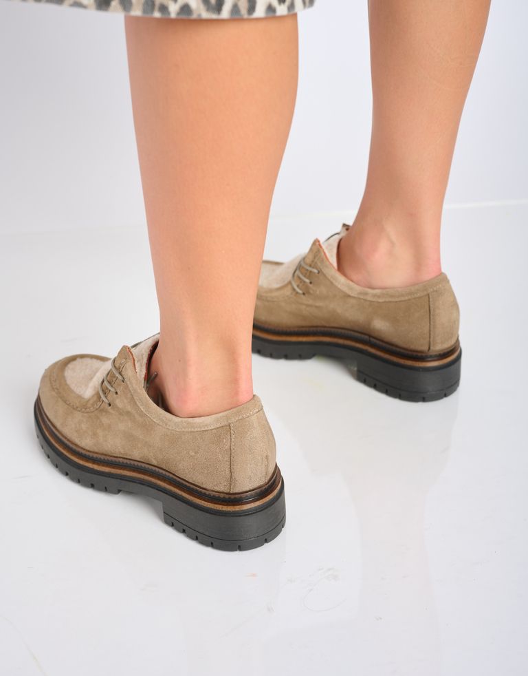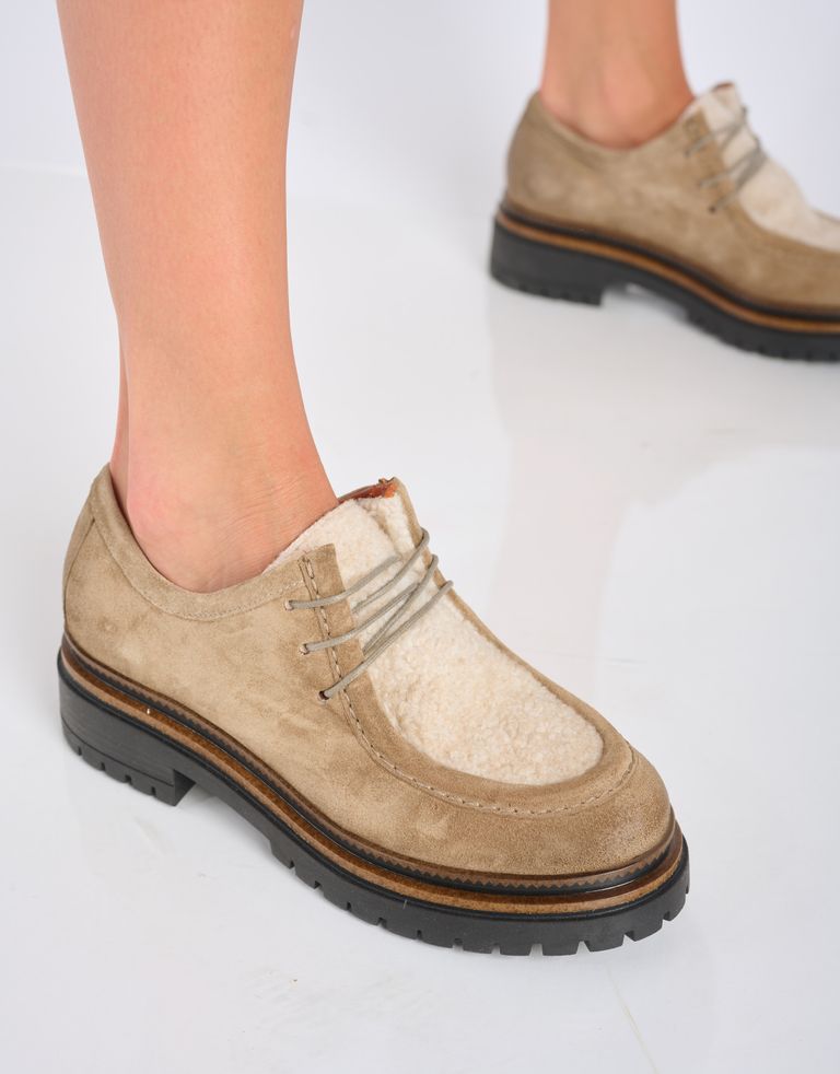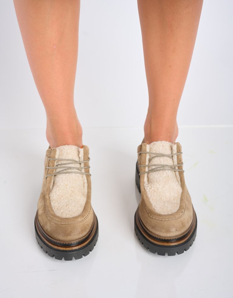 נעליים סגורות בסגנון אוקספורד עם שרוכים, עשויות מזמש בשילוב פרוות צמר סינתטית וסוליית טרקטור צ'אנקית.