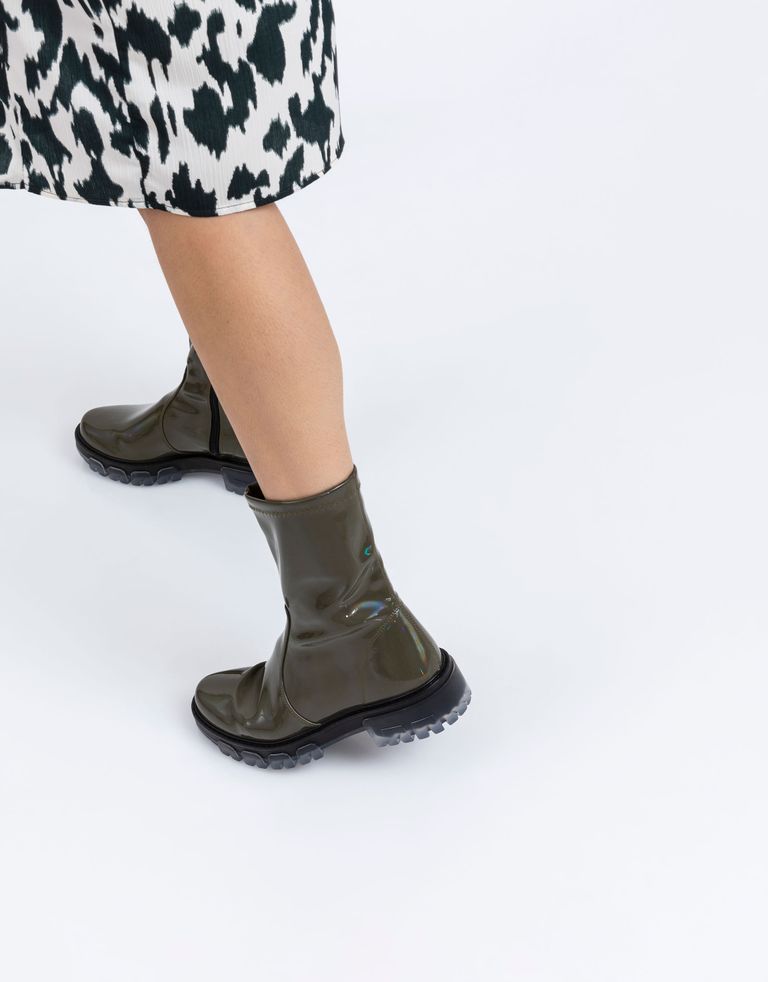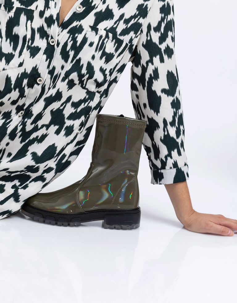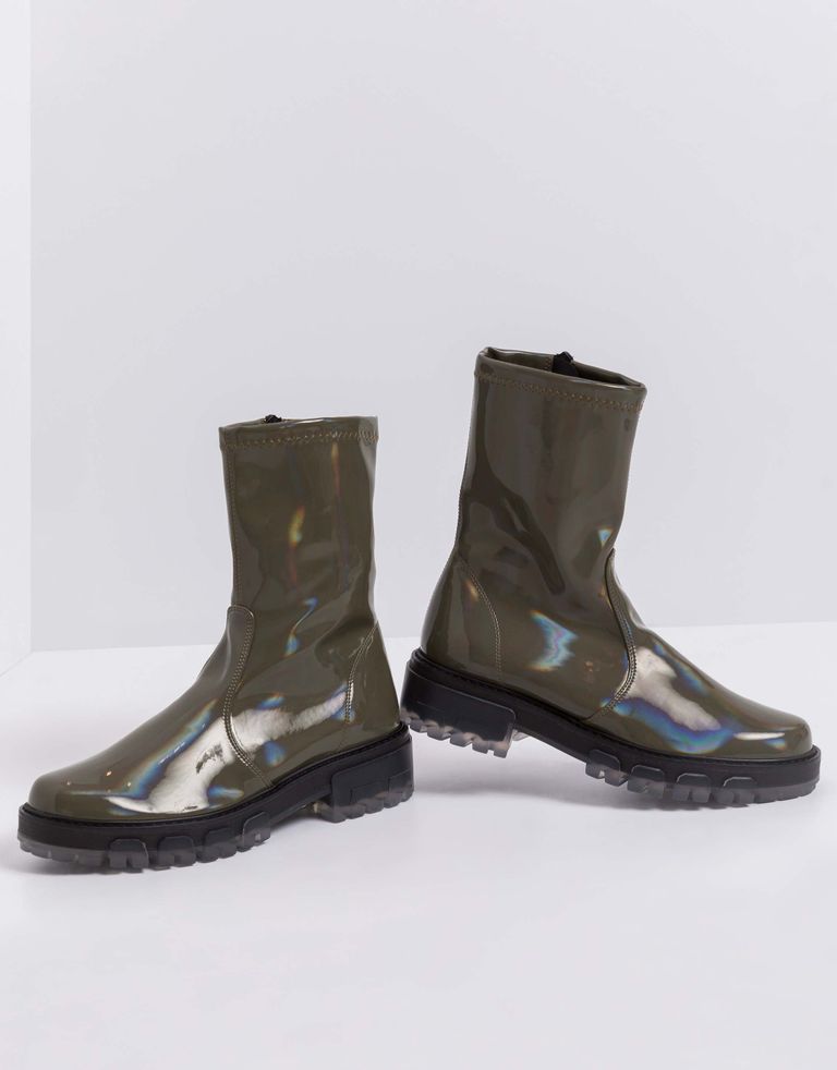 מגפונים INA PATENT דמויי עור בגימור הולוגרמי, מצוידים בסוליית גומי שקפקפה ומגושמת – ממש ניינטיז, רק בטבעוני.